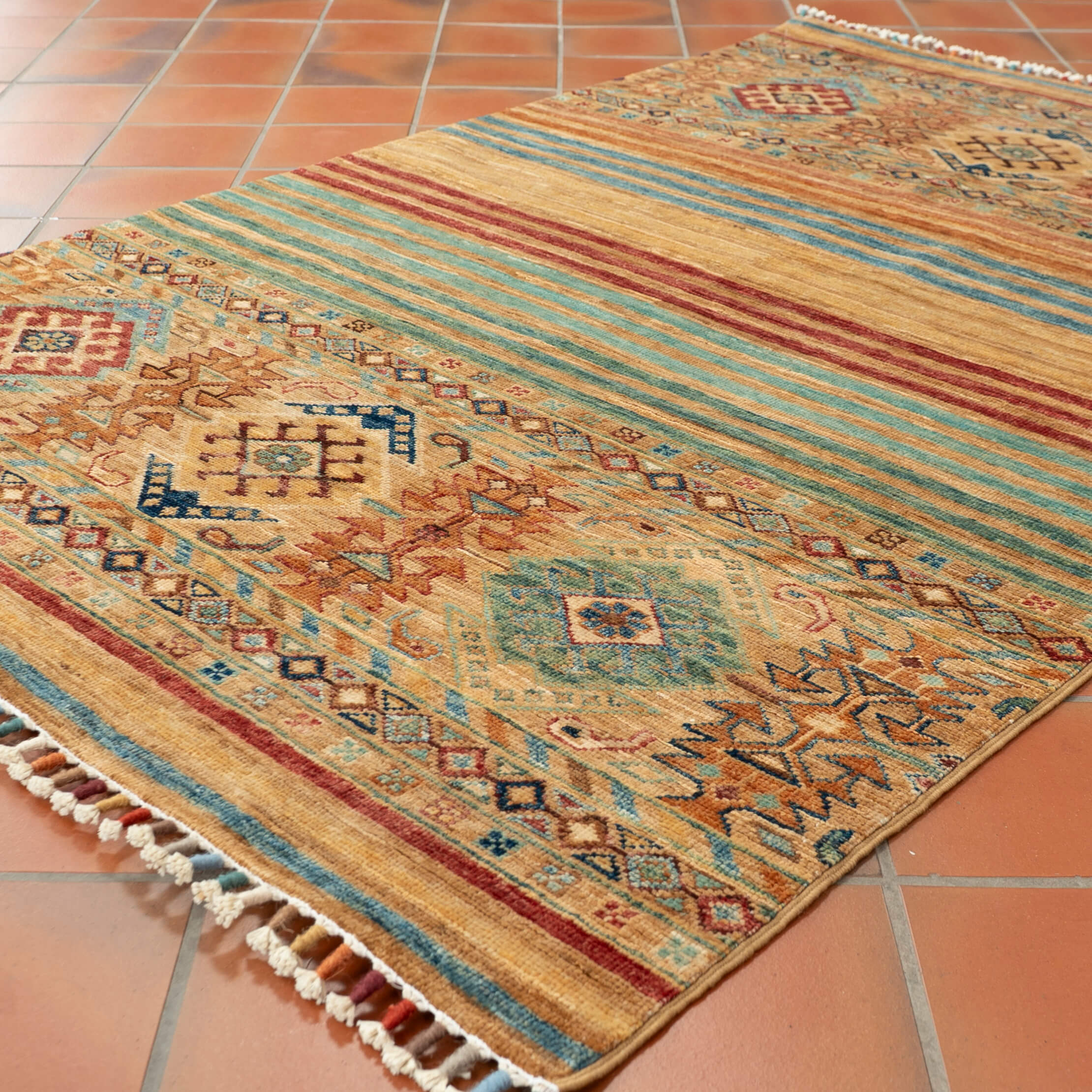 Introduce elegance into your home with our fine Afghan Samarkand rug. Crafted by skilled artisan weavers using traditional techniques and vegetable-dyed handspun wool, this piece features a striking design that blends traditional Caucasian patterns with modern stripes. The colourful palette of old gold, green, turquoise, and tan adds warmth and depth to any space.  Please click the hyperlinks in gold if you are interested in additional information. These beautiful pieces are relatively new, appearing on the market around 2017. These wool rugs and carpets have a certain Caucasian design, similar to Kazak pieces. However, that is where the similarity ends. The...