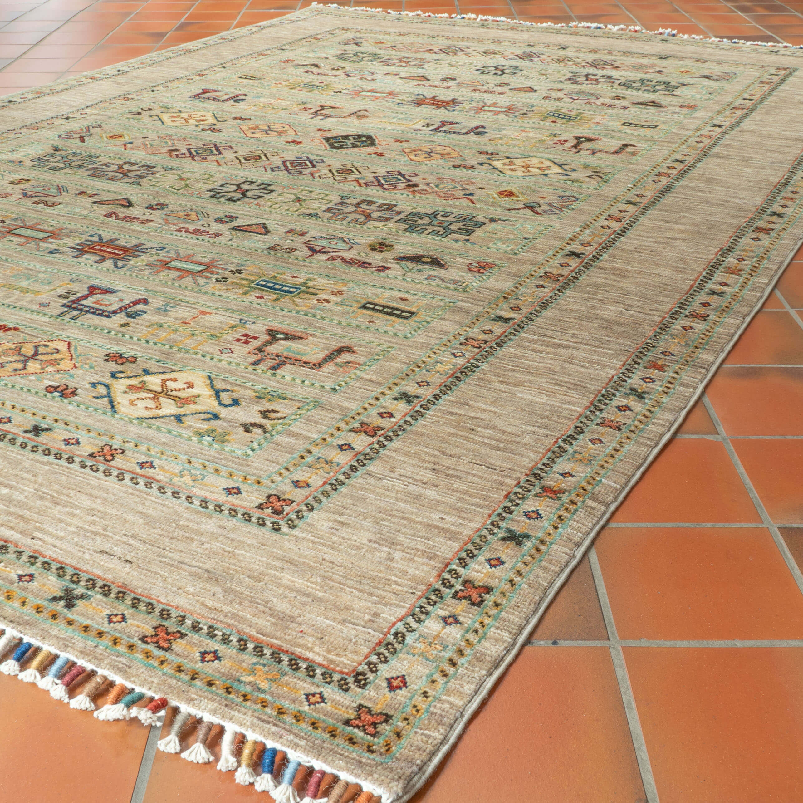 The carpet's final stage in Pakistan involves several processes; initial tensioning and alignment issues may be addressed, followed by surface clipping, herbal washing, and tumbling. This combination of Afghan weaving and finishing in Pakistan has succeeded. These carpets are closely knotted and usually finished with an exciting and unusual bound multicoloured fringe.