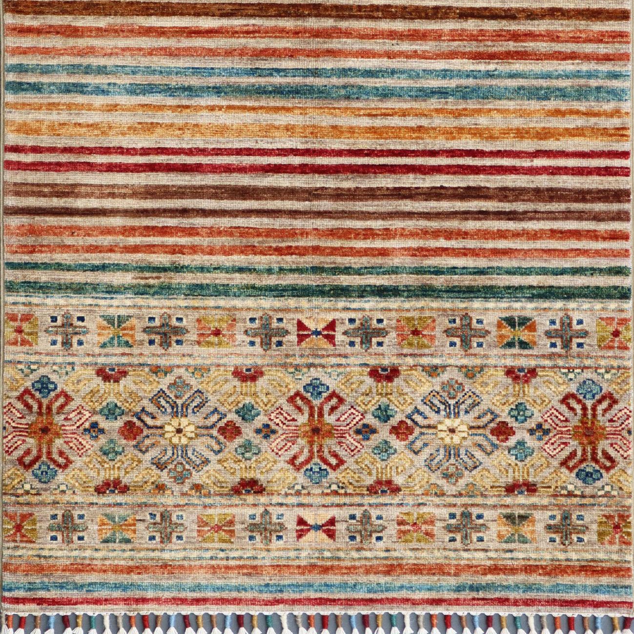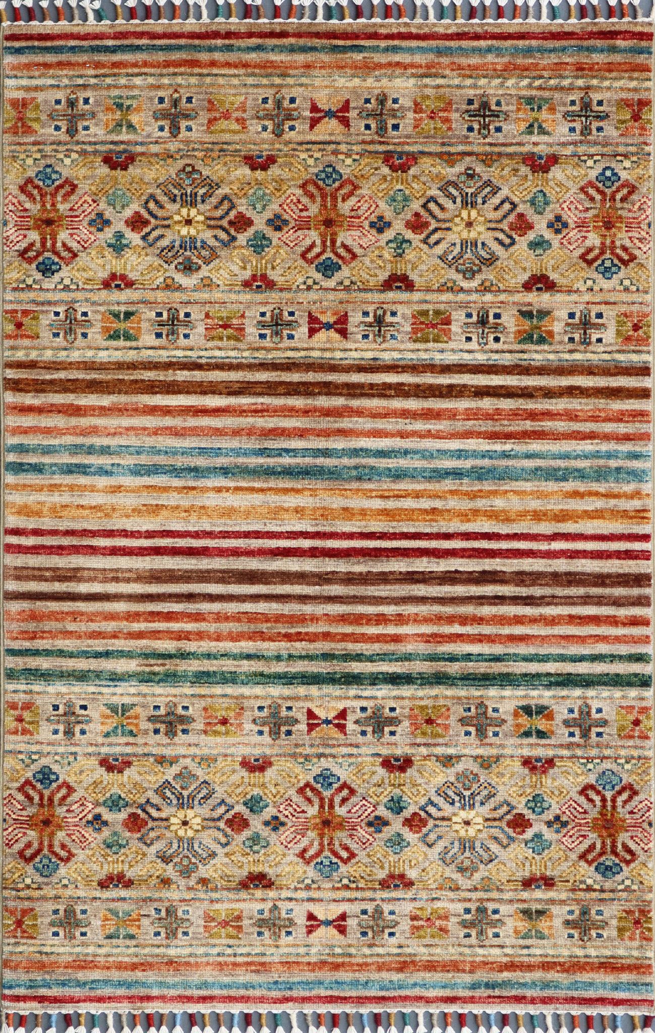 These beautiful pieces are relatively new, appearing on the market around 2017. These wool rugs and carpets have a certain Caucasian design, similar to Kazak pieces. However, that is where the similarity ends. The rugs mostly have bobbin wound fringes, which are brightly coloured, and they do not have any borders. Instead, the old Caucasian design is mixed into bands or stripes of bright colours. Our Afghan Samarkand rugs are handmade using naturally dyed wool on a cotton foundation. The wool used is taken from the native Karakul sheep. It is very tough and has a high natural oil content.