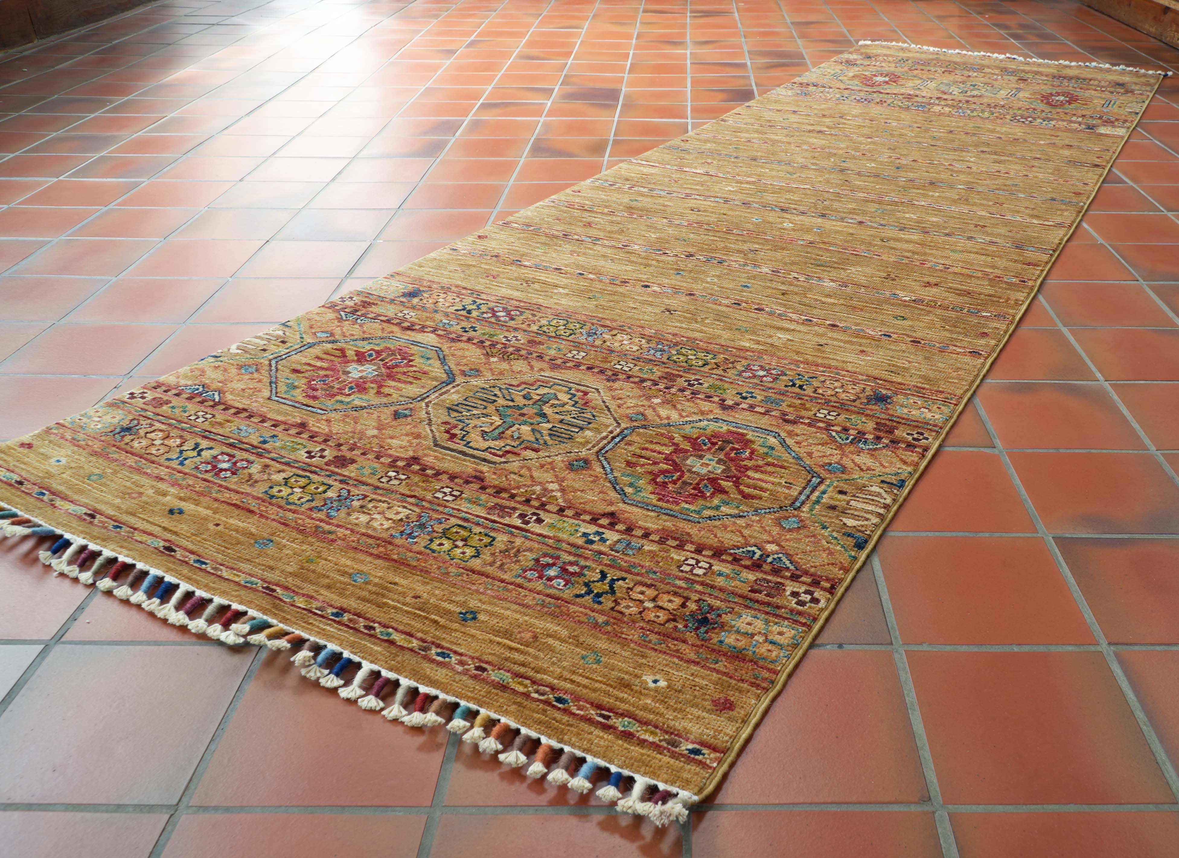 These beautiful pieces are new, appearing on the market around 2017. These wool rugs and carpets have a certain Caucasian design, similar to Kazak pieces. However, that is where the similarity ends. The rugs mostly have bobbin wound fringes, which are brightly coloured, and they do not have any borders. Instead, the old Caucasian design is mixed into bands or stripes of bright colours. Our Afghan Samarkand rugs are handmade using naturally dyed wool on a cotton foundation. The wool used is taken from the native Karakul sheep. It is very tough and has a high natural oil content.