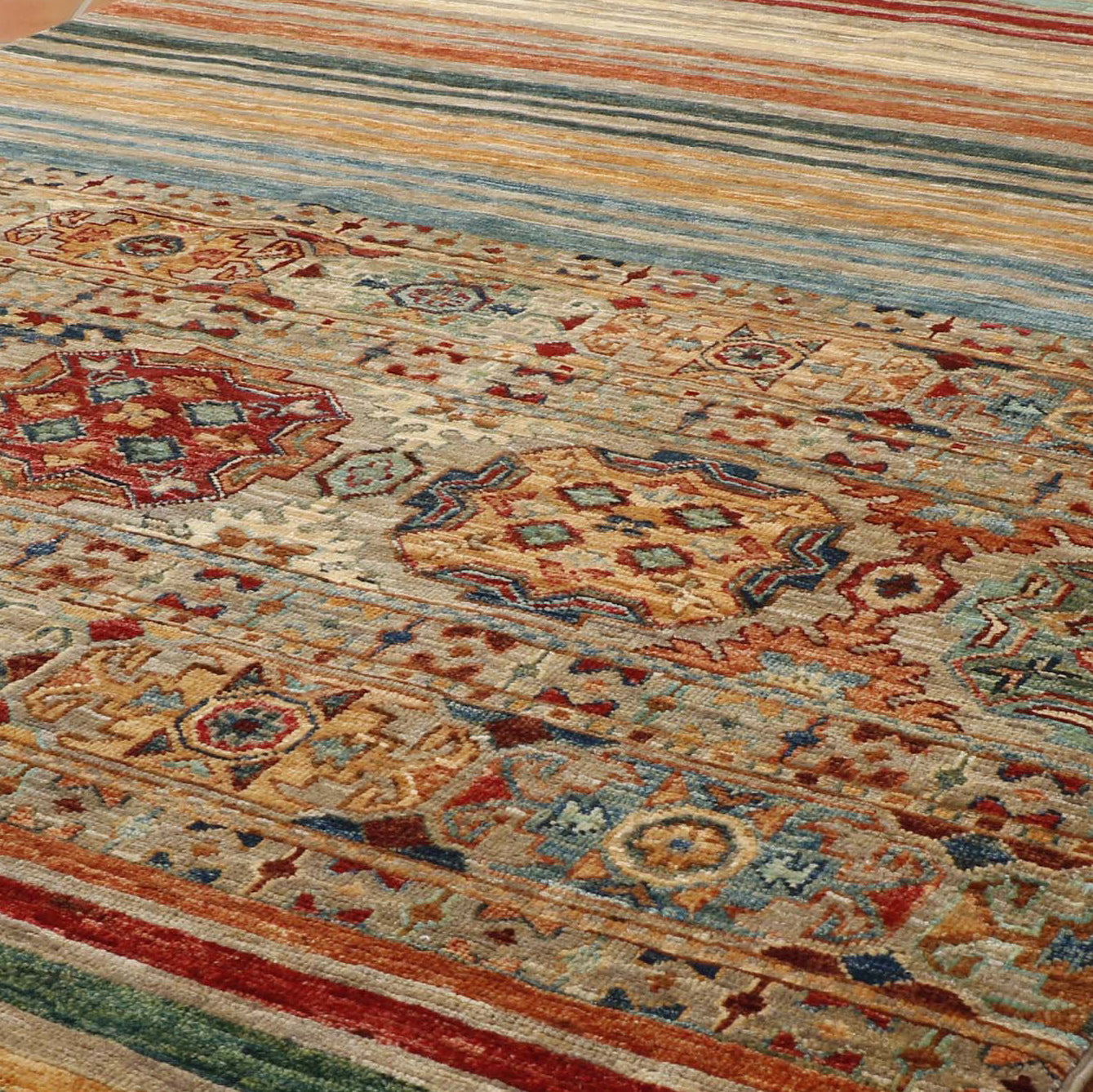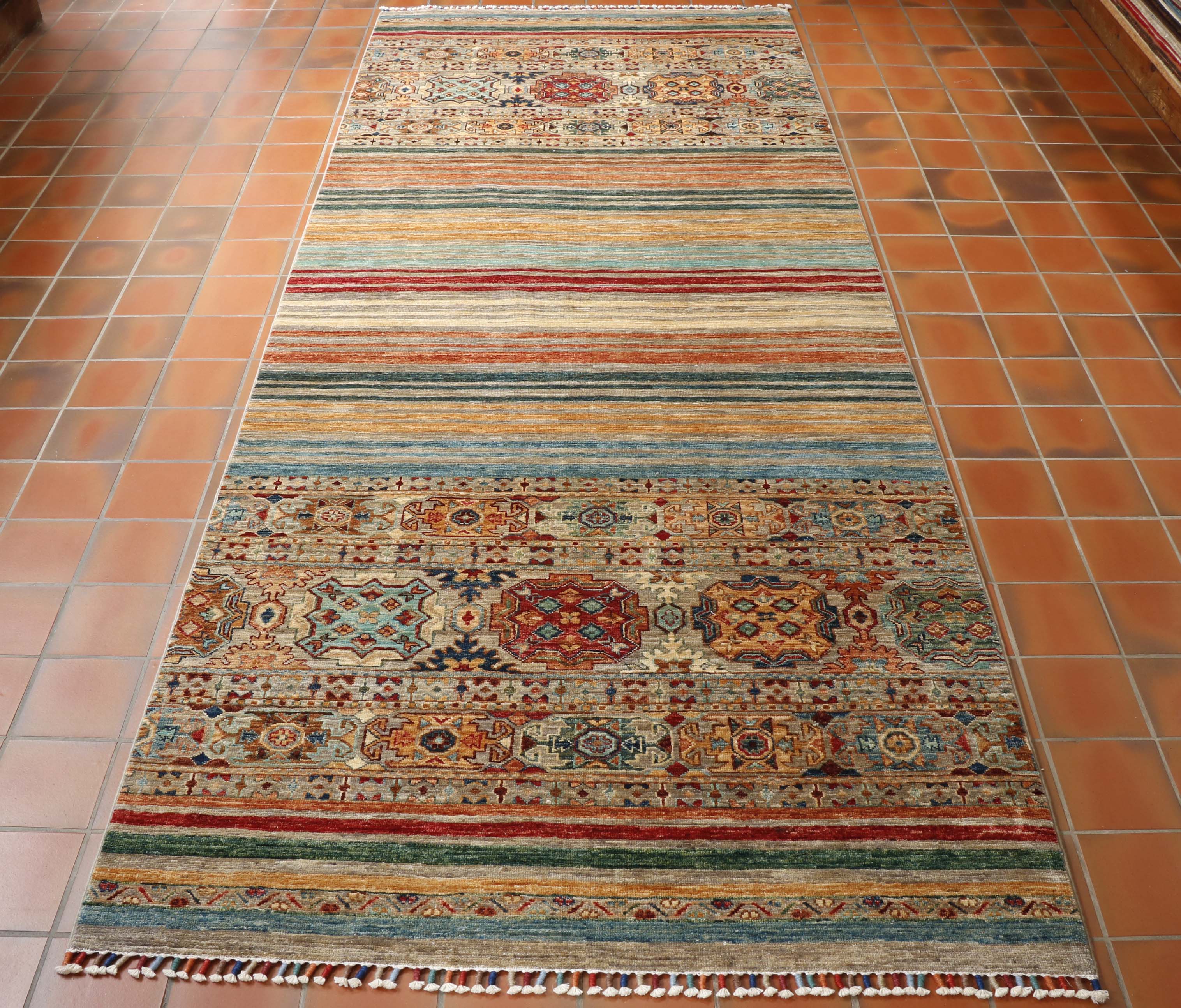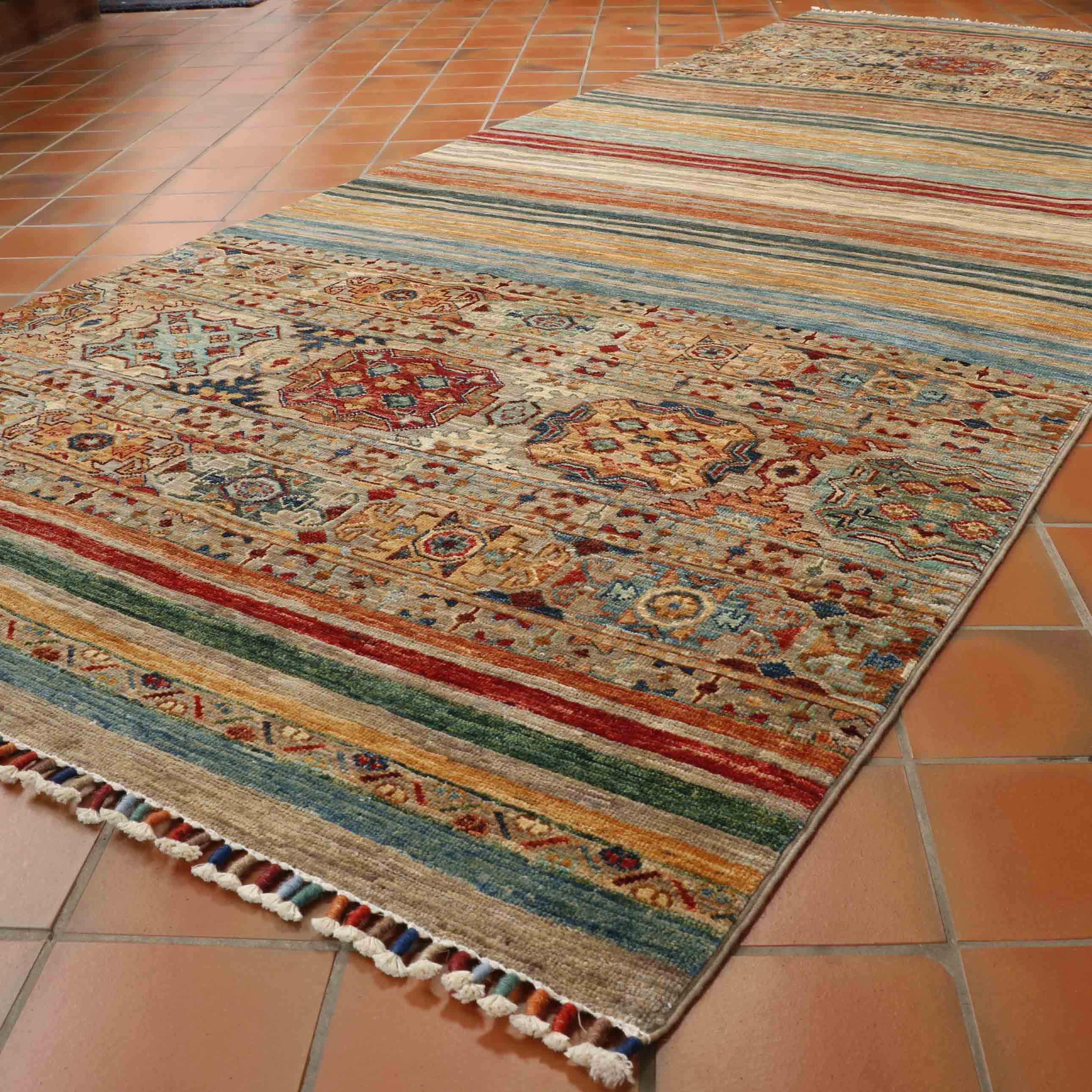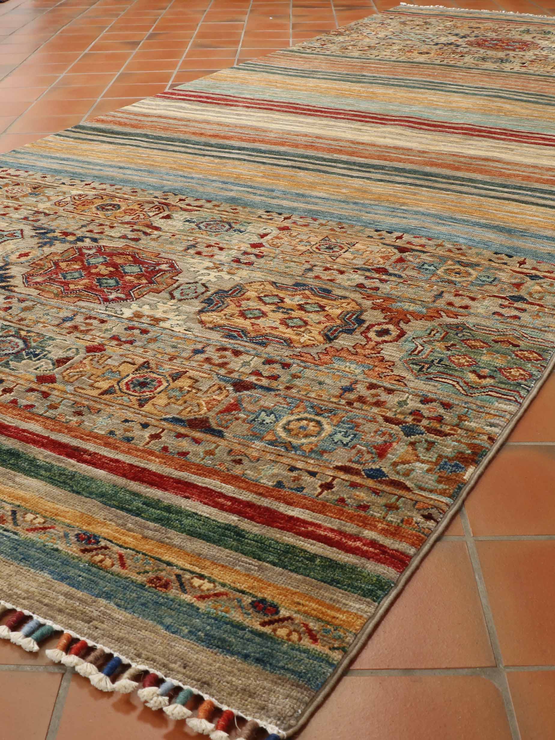 These beautiful pieces are new, appearing on the market around 2017. These wool rugs and carpets have a certain Caucasian design, similar to Kazak pieces. However, that is where the similarity ends. The rugs mostly have bobbin wound fringes, which are brightly coloured, and they do not have any borders. Instead, the old Caucasian design is mixed into bands or stripes of bright colours. Our Afghan Samarkand rugs are handmade using naturally dyed wool on a cotton foundation. The wool used is taken from the native Karakul sheep. It is very tough and has a high natural oil content.