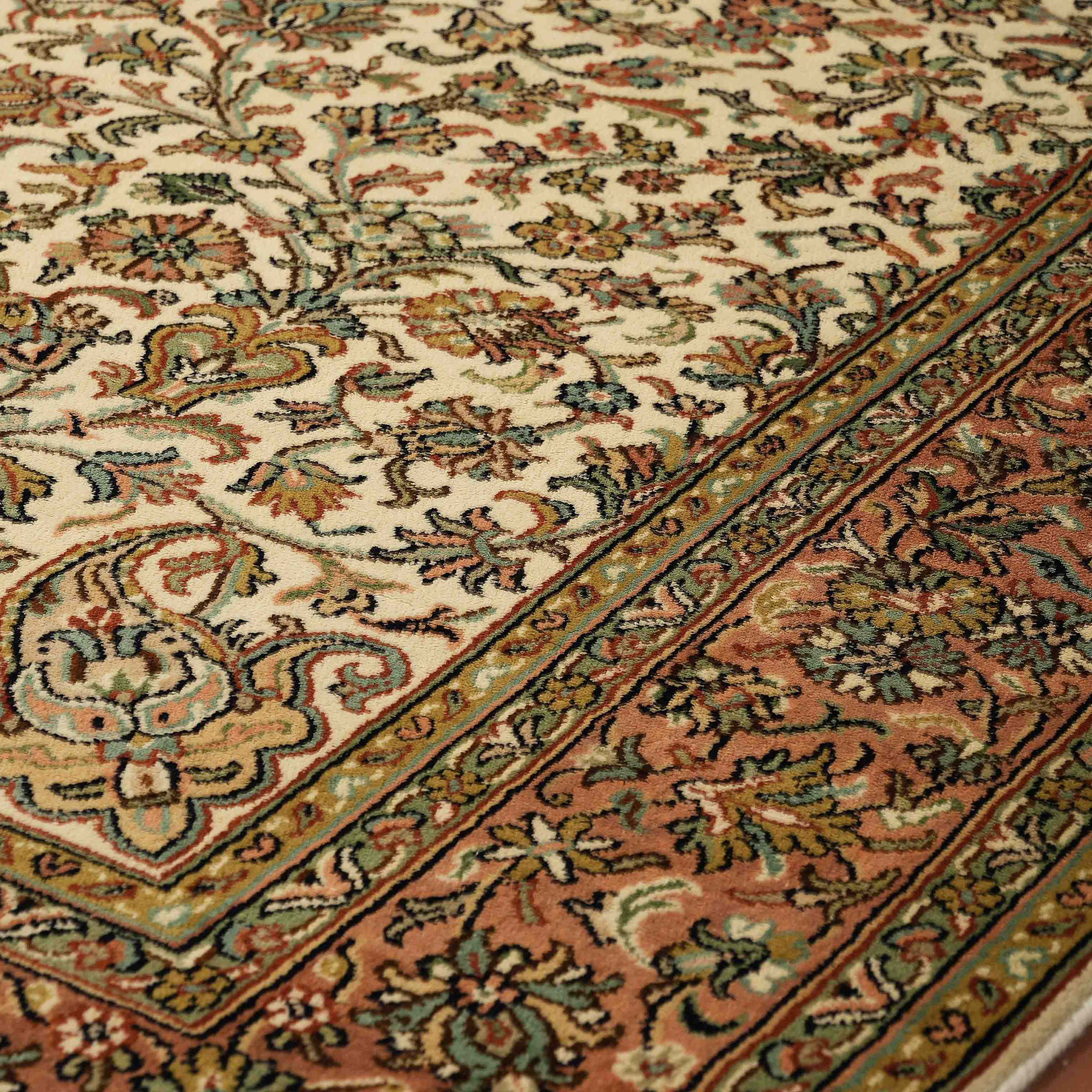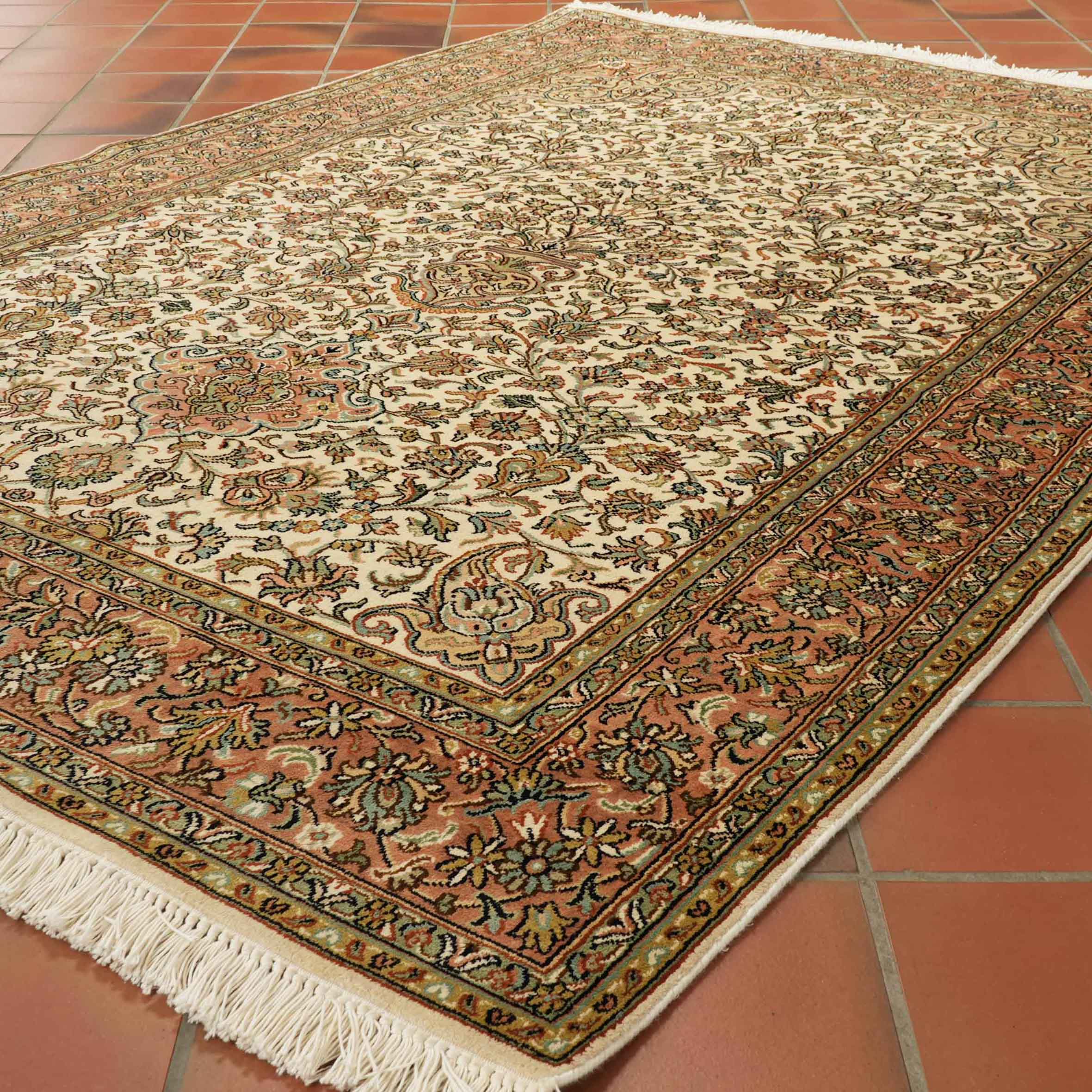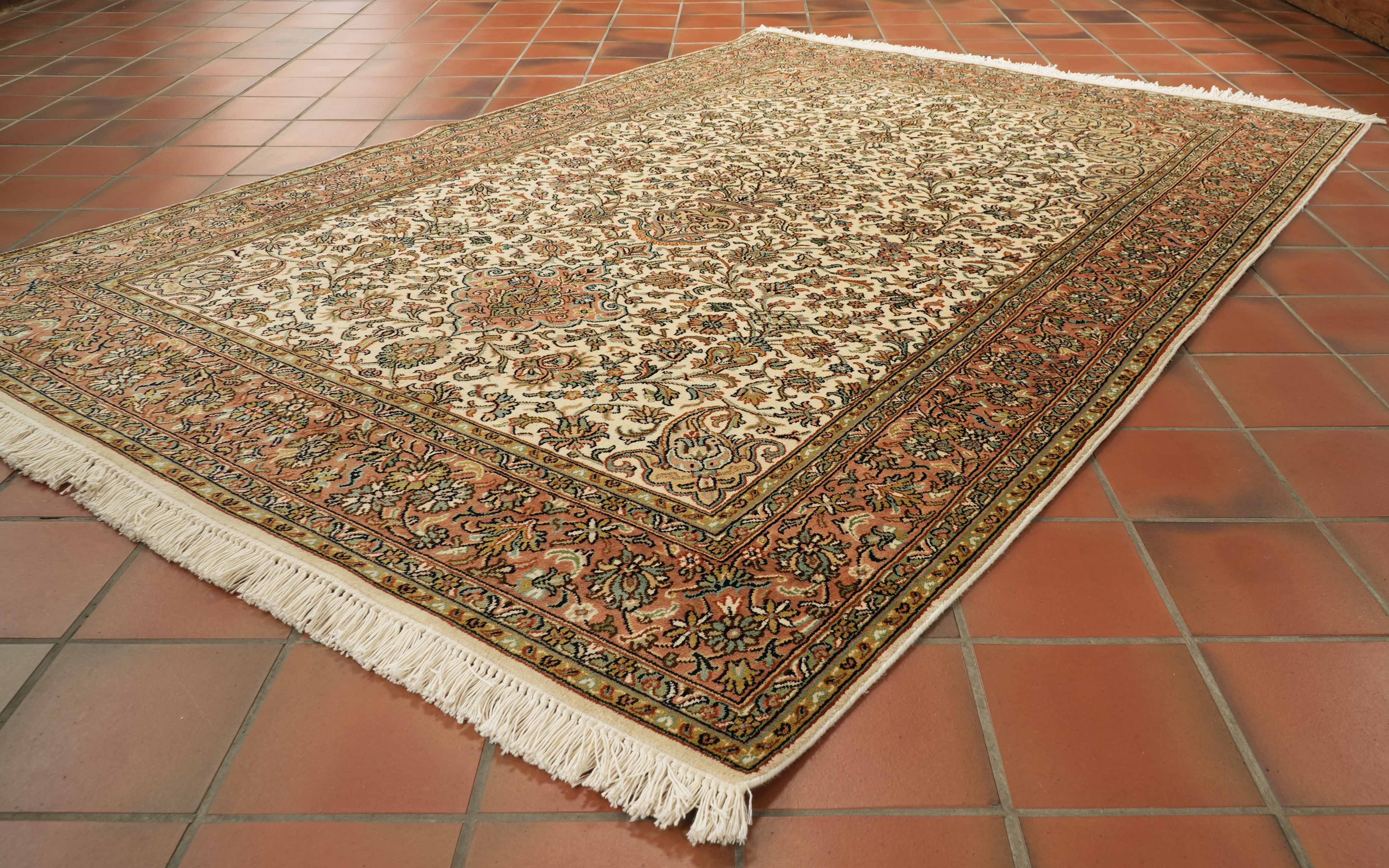 Indulge in luxury with our handmade fine Kashmir silk rug. This exquisite piece boasts a silk pile hand-knotted onto a cotton warp, creating a soft and gentle colour palette with a cream background and a subtle terracotta border accented with green and gold. The traditional prayer arch design is expertly crafted with intricate attention to detail, ensuring a fine-quality rug for your space.