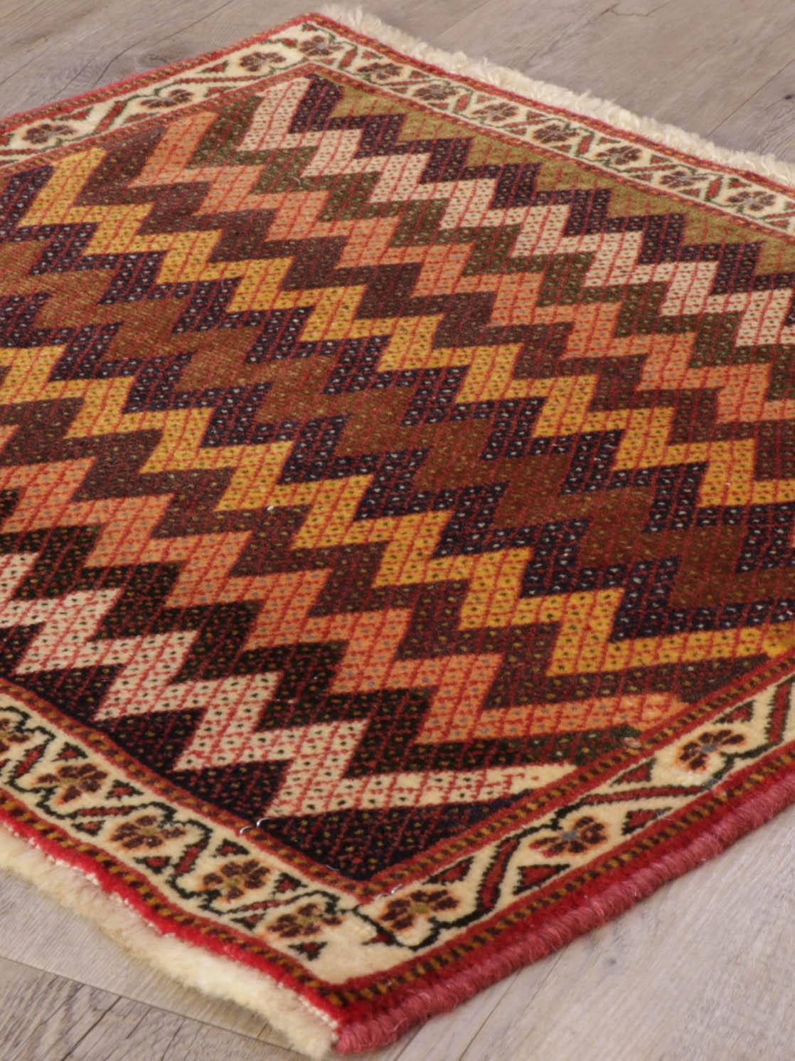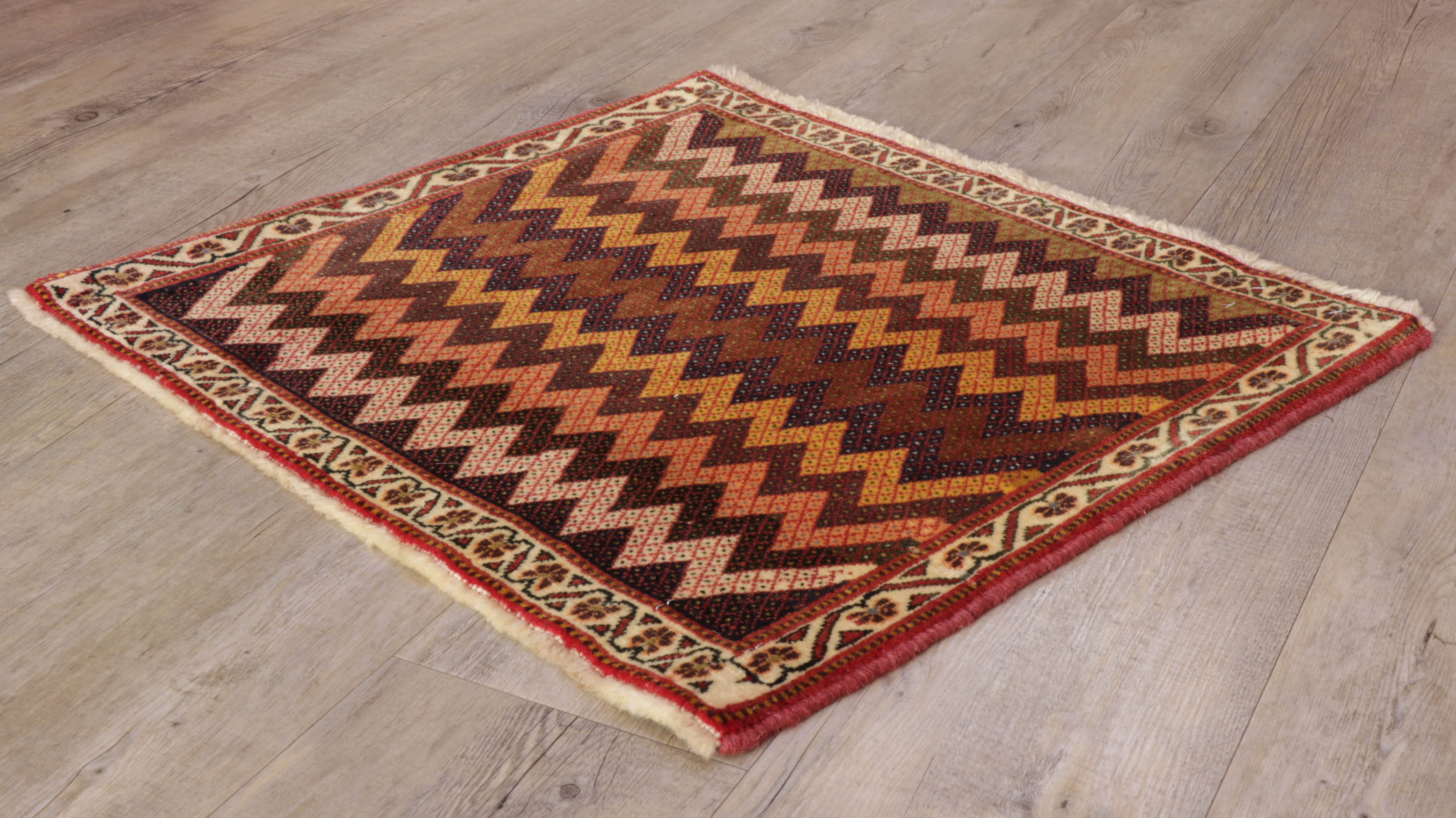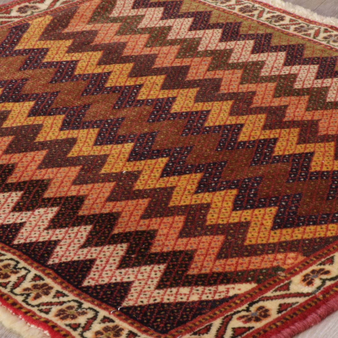 The Qashqai designs are not written or drawn but passed on to daughters who watch their mothers from an early age and gradually develop their skills in a family environment. The women will make these pieces with two or even three generations involved. The piece is knotted by the weavers sitting cross-legged on the floor and the carpet while they craft their art. Meanwhile, the men and boys will defend and protect the animals. In addition to the traditional lozenge-shaped ground with medallions in the centre repeated in the corners, they will often include many birds, animals, flowers, and trees that they see around them. Occasionally, if you were very fortunate, you would come across one with the horse head of Persepolis. As you would expect, these carpets are hand-knotted with wool that has largely been vegetable-dyed. The Kashgai pieces often have an interesting selvedge with bi or tricolour windings like a barber pole. The other distinctive characteristic is that the rug will be knotted on a wool foundation.