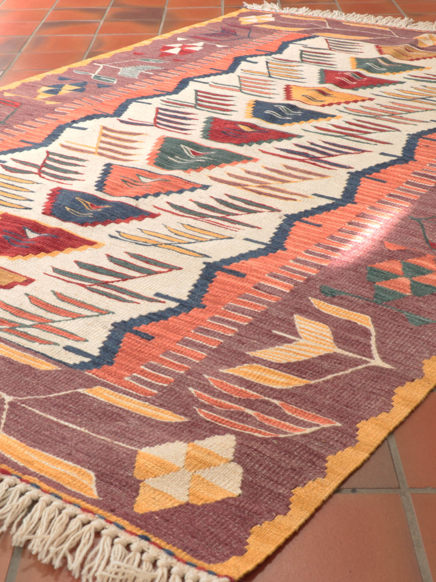 Each of these fine Kilims has been very carefully selected. We have rejected hundreds to narrow it down to a select few which we consider highly desirable. As you would expect, these pieces are significantly more expensive than standard Kilims. However, they are anything but standard, and we believe that they will meet the discerning buyer's expectations. Please be advised that this type of kilim has a definite front face and would be used on one side for the best effect.