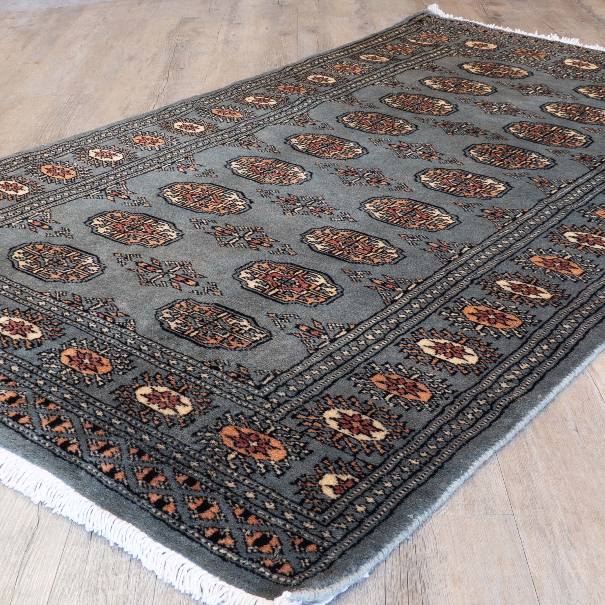 The well-known Bokhara design originated in Uzbekistan, where nomadic Turkoman tribespeople first sold their rugs. The repetitive octagonal motif, or "gul" (Persian for rose), is characteristic of Bokhara rugs, and today Pakistani people weave this design in a wide range of colours and sizes.