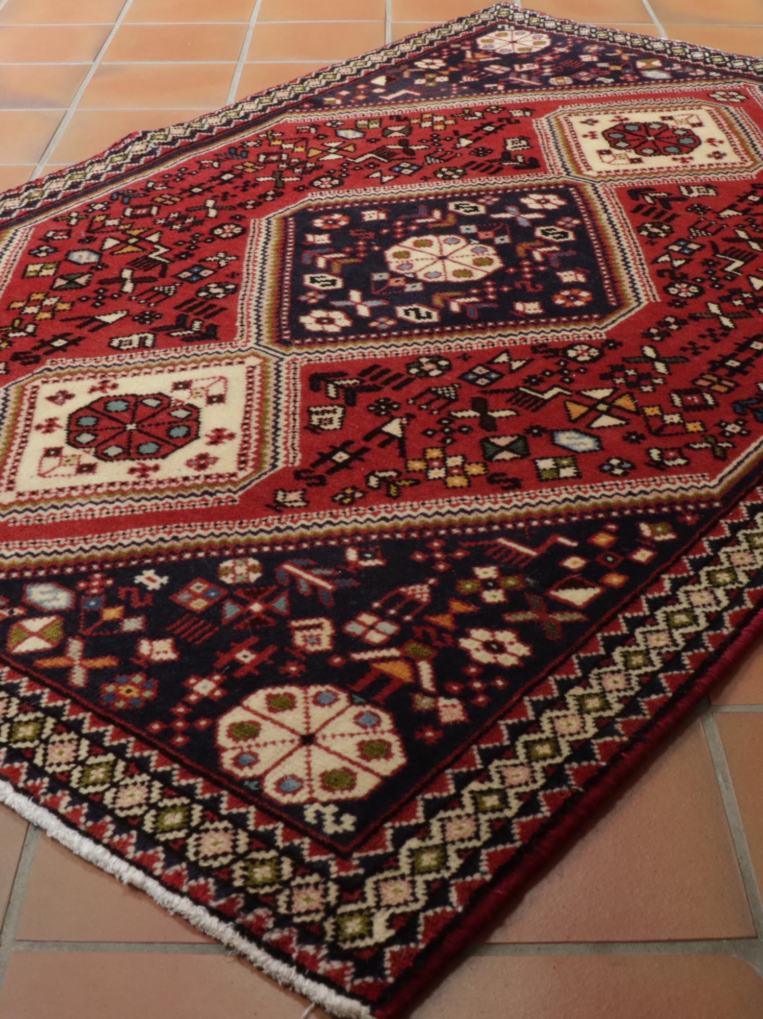 Persian Abadeh rugs and runners have a design and colour layout inspired loosely by the Qashqai nomadic tribes who pass through the Abadeh region, located around Shiraz. They are produced from wool and handmade onto a cotton foundation.