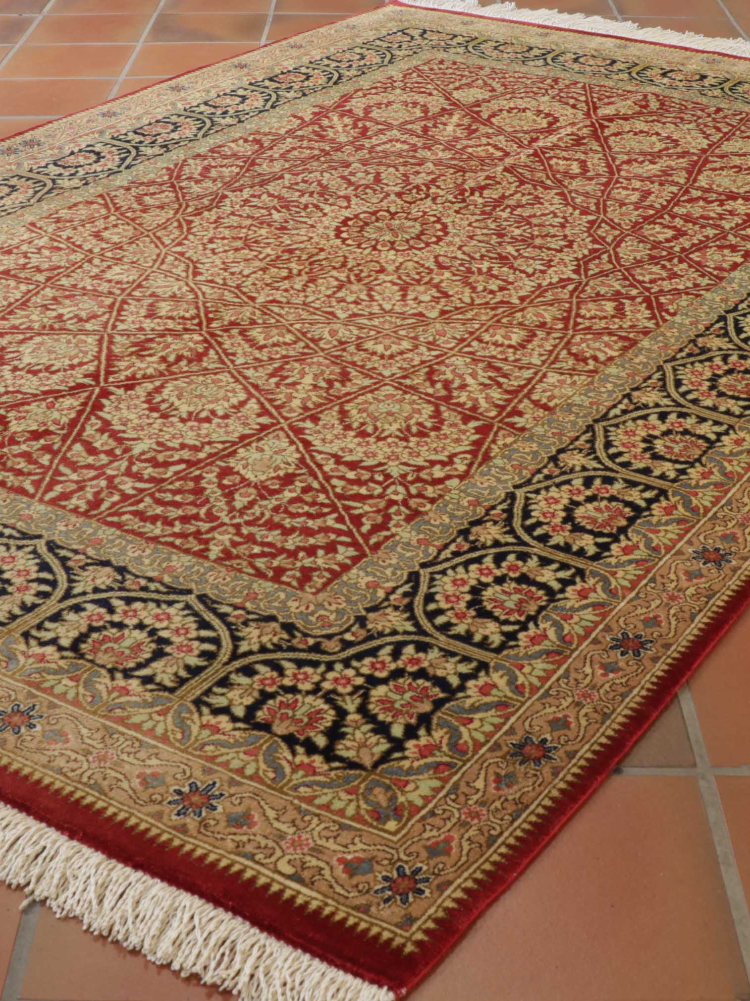 Indulge in luxury with our Handmade Oriental Qum silk rug. Made in Qum, this 100% silk rug boasts an extra fine quality and a beautiful sheen. Its ornate, intricate design and opulent colouring add an elegant touch to any space, while its soft and luxurious feel will elevate your interior to the next level.