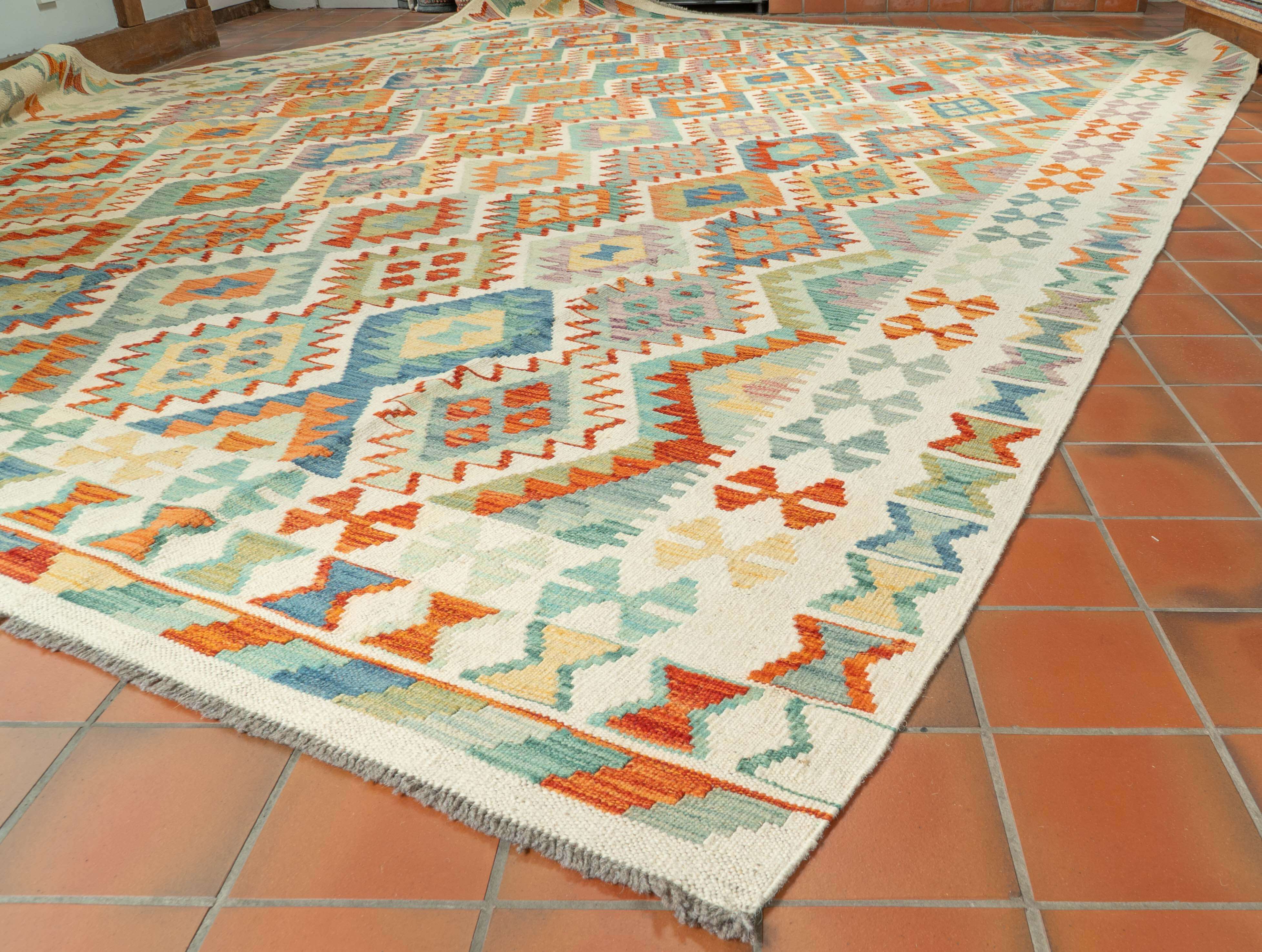 Experience the quality and tradition of Afghan craftsmanship with our large handmade Kilim in soft colourings. This flat-weave kilim is woven from traditional, vegetable-dyed wool, making it durable and ideal for use with underfloor heating. Its colourful and striking design is reversible, allowing it to be used as a floor covering, wall hanging, or throw. Upgrade your space with this beautiful and inexpensive piece.