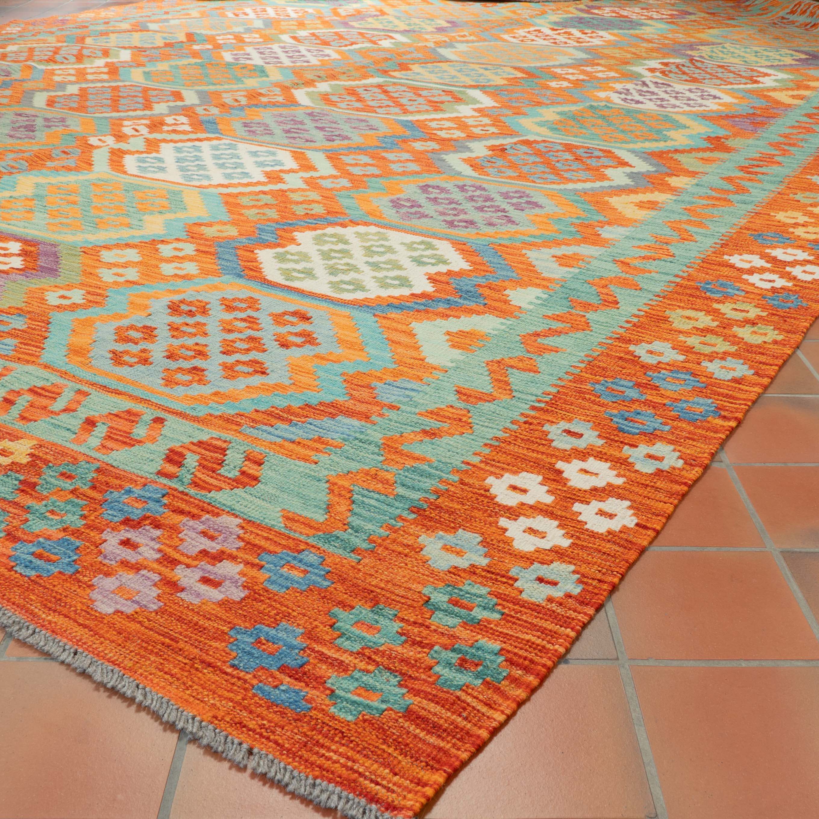 Experience the quality and tradition of Afghan craftsmanship with our handmade Kilim in rich, vibrant colourings. It is woven with traditional vegetable-dyed wool, making it durable and perfect for underfloor heating. Its colourful and striking design is reversible, allowing it to be used as a floor covering, wall hanging, or throw. Upgrade your space with this beautiful and inexpensive piece.