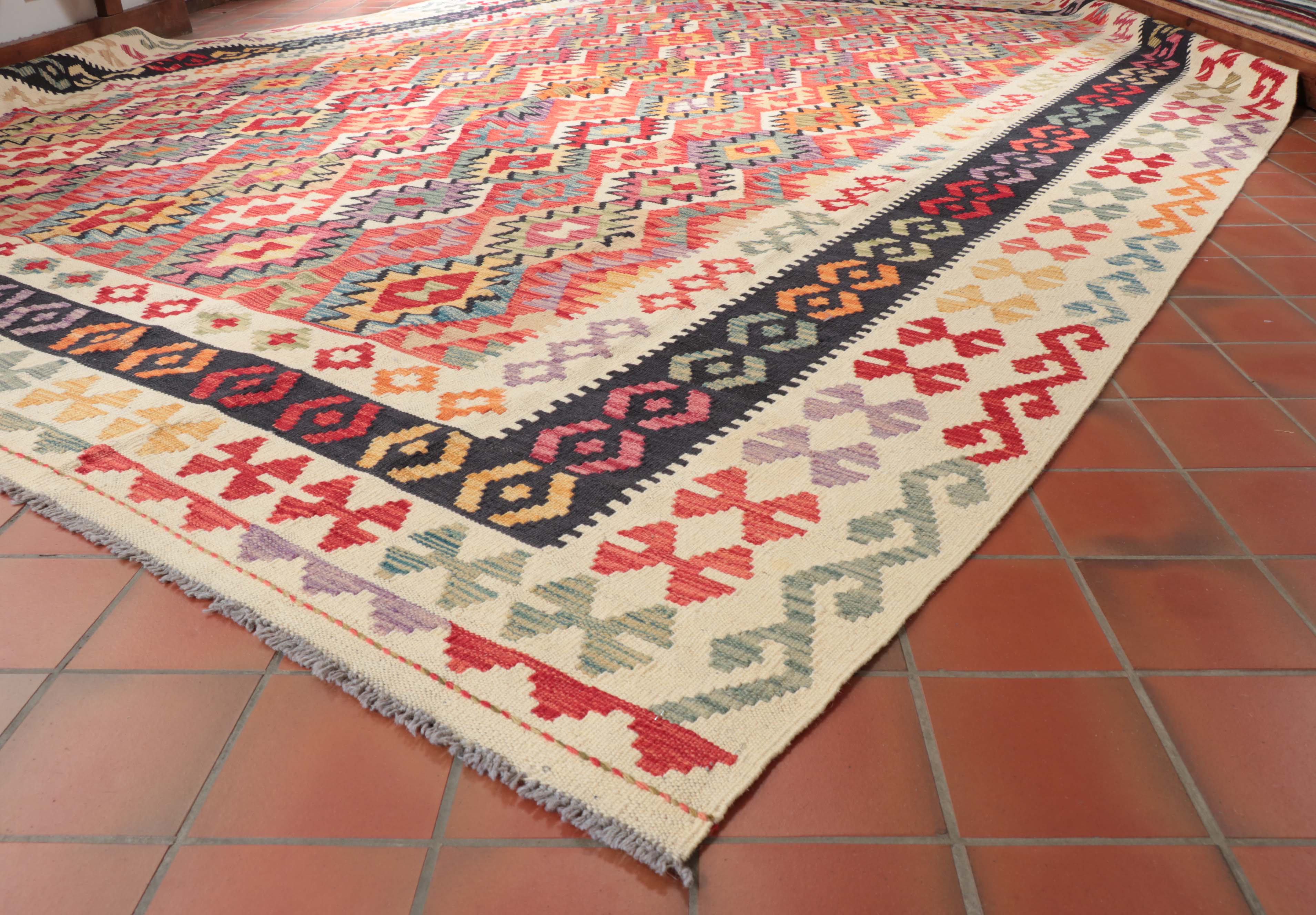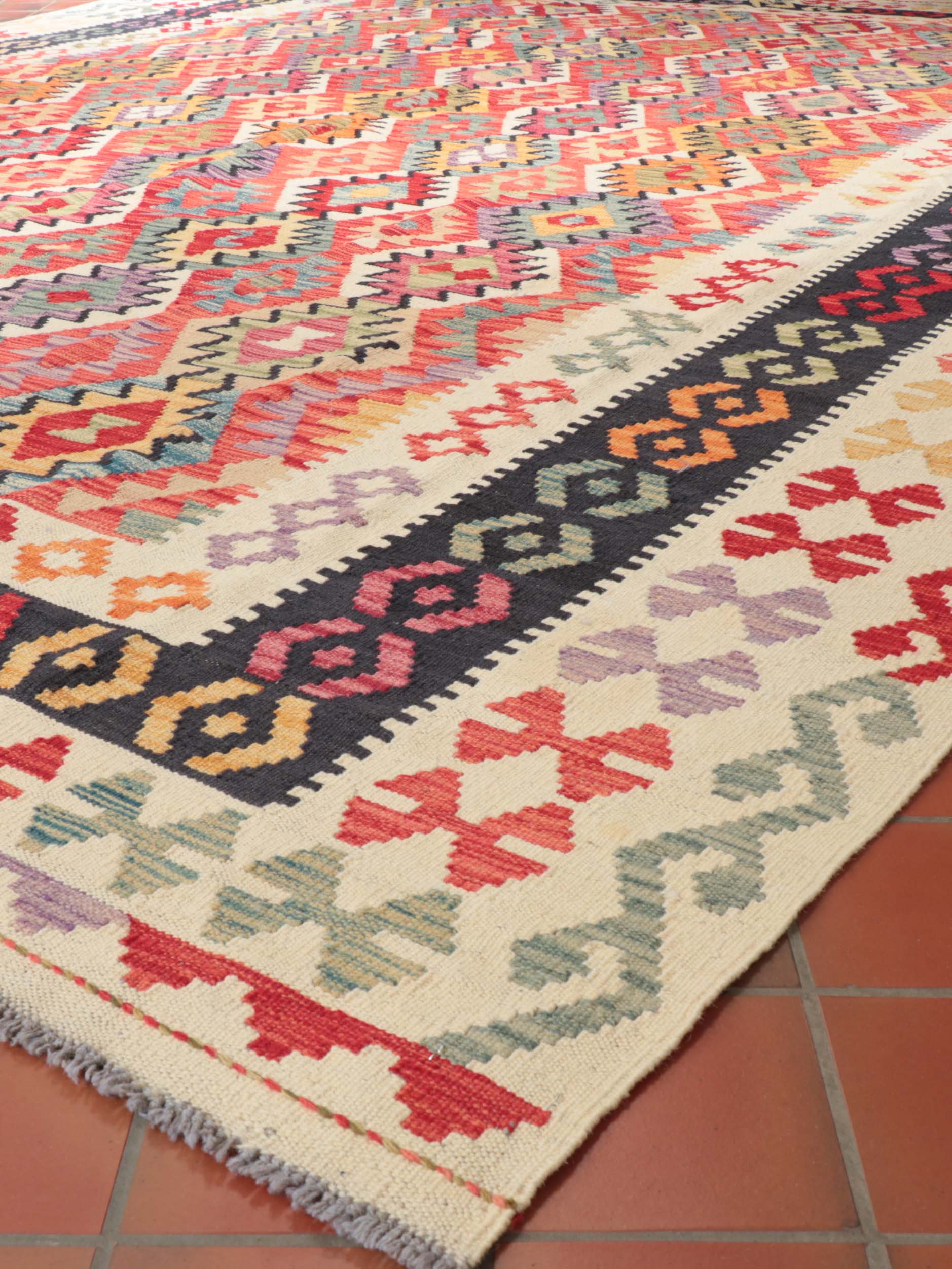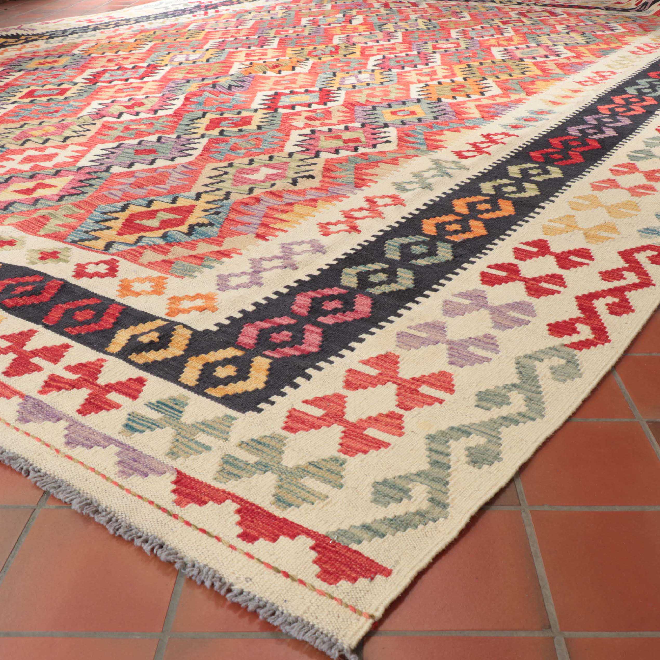 Expertly crafted in Afghanistan, this handmade oversized Afghan Kilim is a light, bright, and colourful addition to any space. Made from traditional vegetable-dyed wool, this flatweave kilim is striking in design and reversible. It works well with underfloor heating and is perfect for use on the floor or as a unique wall hanging or throw.  Please click the hyperlinks in gold if you are interested in additional information.Kilim rugs are serviceable and practical, giving the owner the advantage of being made from one of the most beautiful natural wool yarns, and are often completely reversible. The vegetable-dyed wool is a beautiful natural...