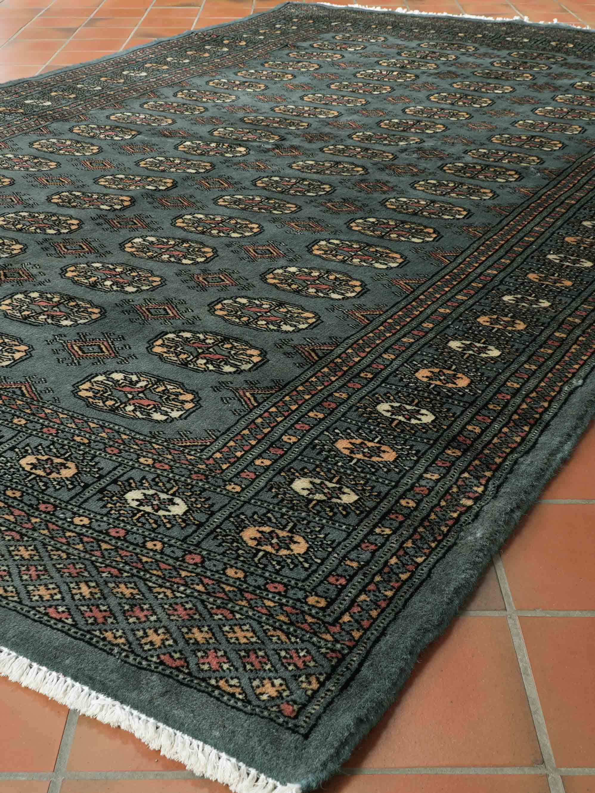 This Pakistan Bokhara rug is finely knotted in a traditional design using lovely, soft, silky wool. The Bokhara rugs are always made with a wool pile, but unfortunately, some people try to pass them off as silk. Handmade Bokhara rugs are incredibly good value.