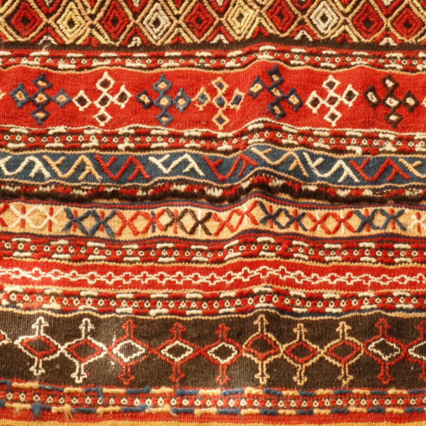 Balochistan, bordering Kerman, Pakistan and southern Afghanistan, is home to the Baloch (also known as Belouch) rug. Belouch hand-knotted rugs are made on a cotton or wool foundation, and goat hair is normally used for the hem. The main colours used in the design of these rugs are dark red, brown, and blue for the background, with contrasting touches of white, ivory, cream, or a yellow hue. The designs are normally geometric, and the colours are generally quite dark. They represent good value for money.