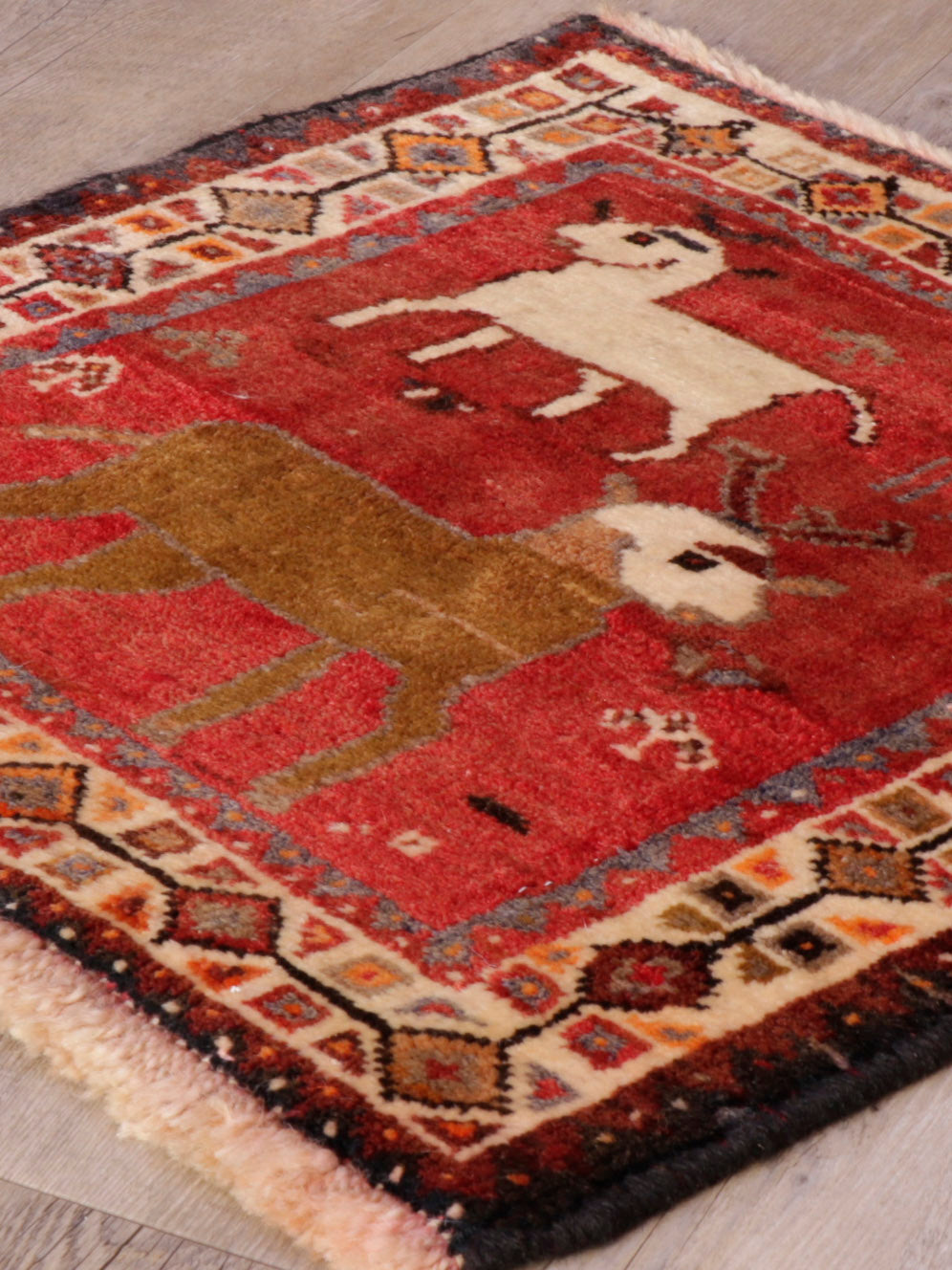 The Qashqai designs are not written or drawn but passed on to daughters who watch their mothers from an early age and gradually develop their skills in a family environment. The women will make these pieces with two or even three generations involved. The piece is knotted by the weavers sitting cross-legged on the floor and the carpet while they craft their art. Meanwhile, the men and boys will defend and protect the animals. In addition to the traditional lozenge-shaped ground with medallions in the centre repeated in the corners, they will often include many birds, animals, flowers, and trees that they see around them. Occasionally, if you were very fortunate, you would come across one with the horse head of Persepolis. As you would expect, these carpets are hand-knotted with wool that has largely been vegetable-dyed. The Kashgai pieces often have an interesting selvedge with bi or tricolour windings like a barber pole. The other distinctive characteristic is that the rug will be knotted on a wool foundation.