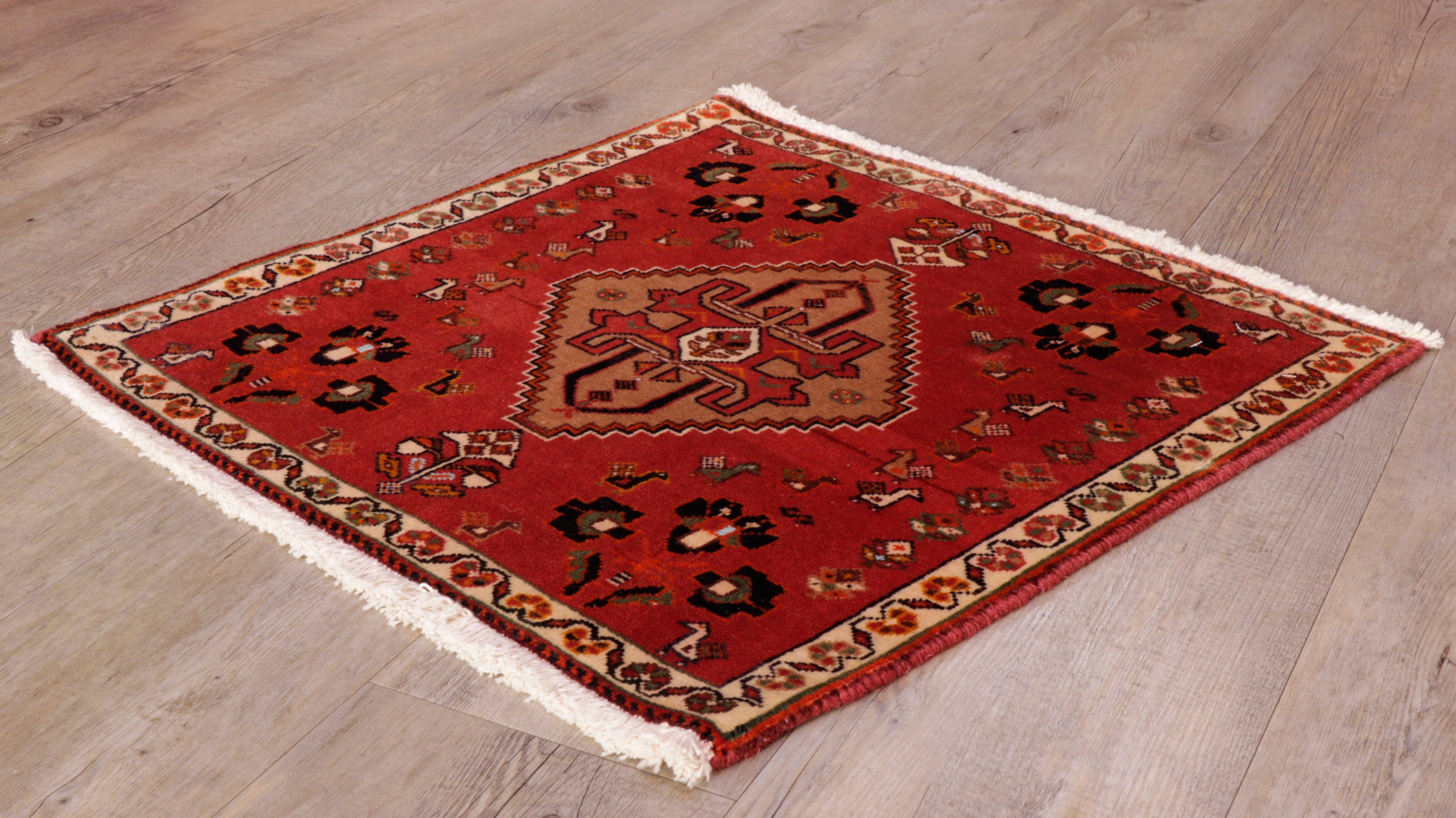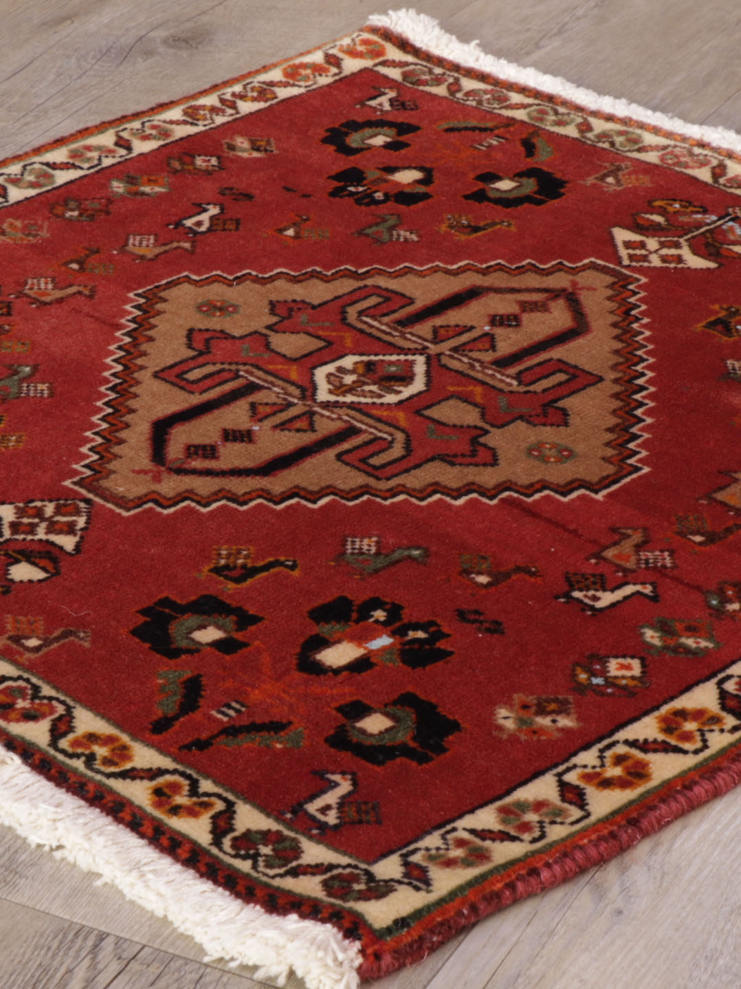 The Qashqai designs are not written or drawn but passed on to daughters who watch their mothers from an early age and gradually develop their skills in a family environment. The women will make these pieces with two or even three generations involved. The piece is knotted by the weavers sitting cross-legged on the floor and the carpet while they craft their art. Meanwhile, the men and boys will defend and protect the animals. In addition to the traditional lozenge-shaped ground with medallions in the centre repeated in the corners, they will often include many birds, animals, flowers, and trees that they see around them. Occasionally, if you were very fortunate, you would come across one with the horse head of Persepolis. As you would expect, these carpets are hand-knotted with wool that has largely been vegetable-dyed. The Kashgai pieces often have an interesting selvedge with bi or tricolour windings like a barber pole. The other distinctive characteristic is that the rug will be knotted on a wool foundation.