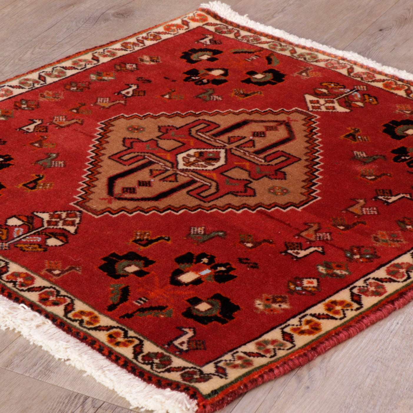 Handmade by the last wandering people called Qashqai, this small square Oriental Qashqai rug showcases traditional craftsmanship and is made with vegetable-dyed wool. Its delightful soft terracotta colour and central fawn medallion add to its charm and cultural significance. The rug makes a wonderful small table cover or wall hanging and, if preferred, a simple, practical mat.