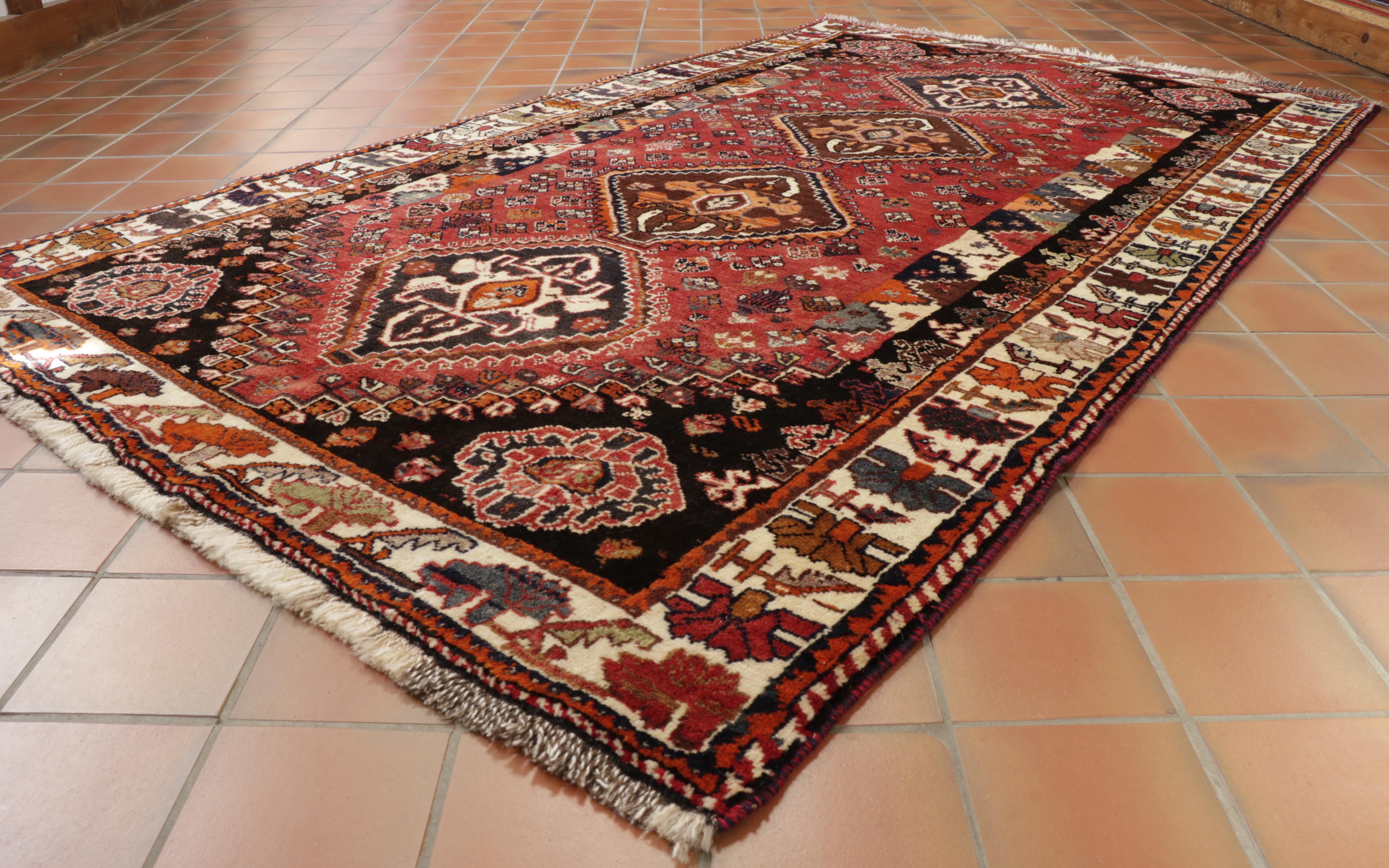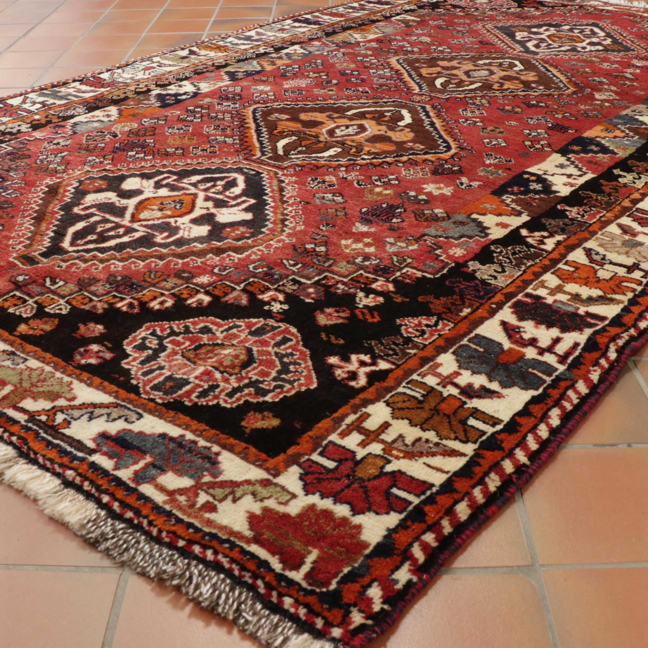 The Qashqai designs are not written or drawn but passed on to daughters who watch their mothers from an early age and gradually develop their skills in a family environment. The women will make these pieces with two or even three generations involved. The piece is knotted by the weavers sitting cross-legged on the floor and the carpet while they craft their art. Meanwhile, the men and boys will defend and protect the animals. In addition to the traditional lozenge-shaped ground with medallions in the centre repeated in the corners, they will often include many birds, animals, flowers, and trees that they see around them. Occasionally, if you were very fortunate, you would come across one with the horse head of Persepolis. As you would expect, these carpets are hand-knotted with wool that has largely been vegetable-dyed. The Kashgai pieces often have an interesting selvedge with bi or tricolour windings like a barber pole. The other distinctive characteristic is that the rug will be knotted on a wool foundation.