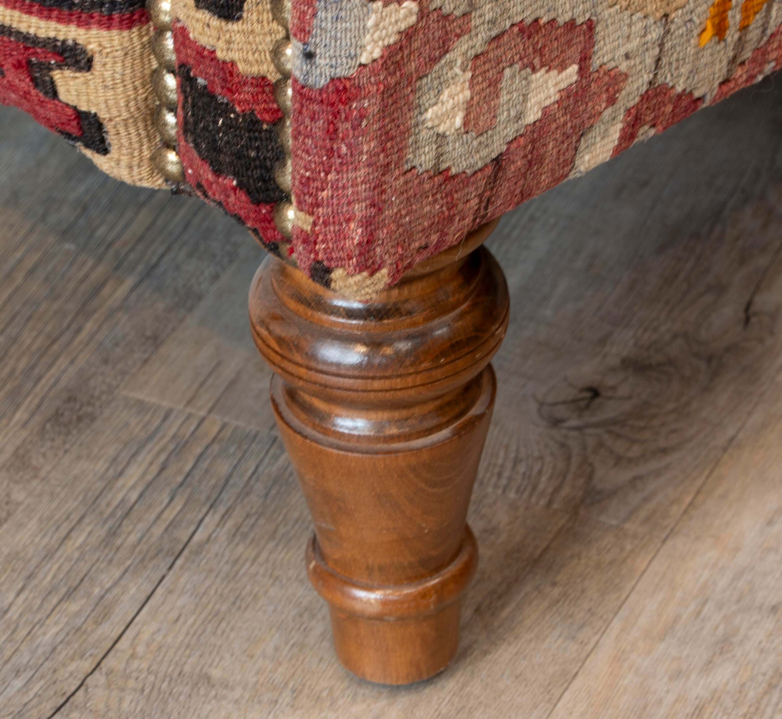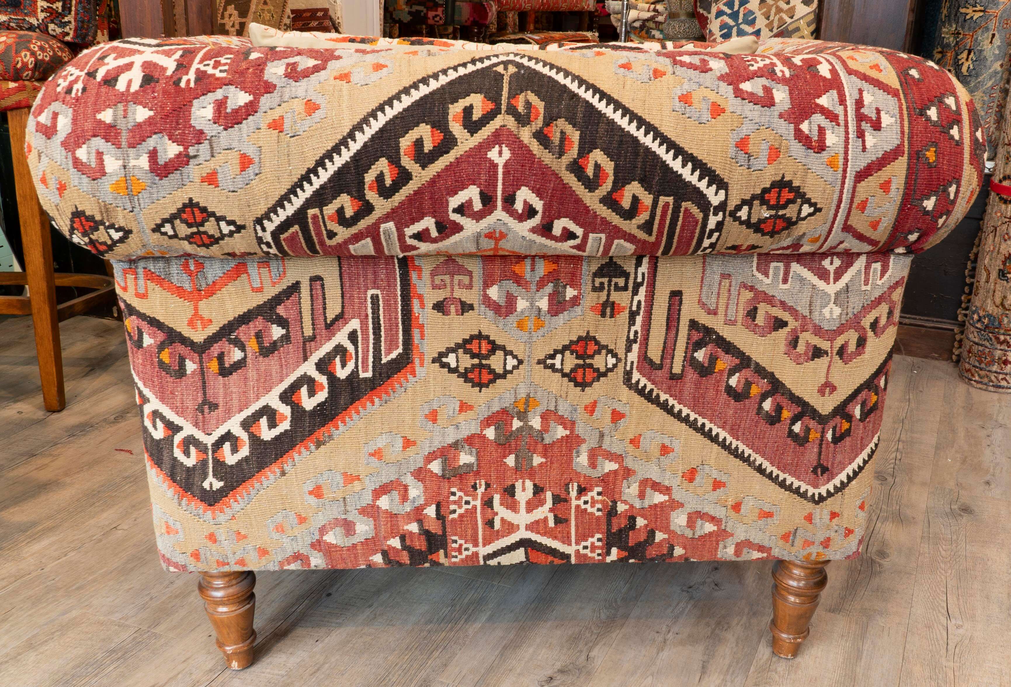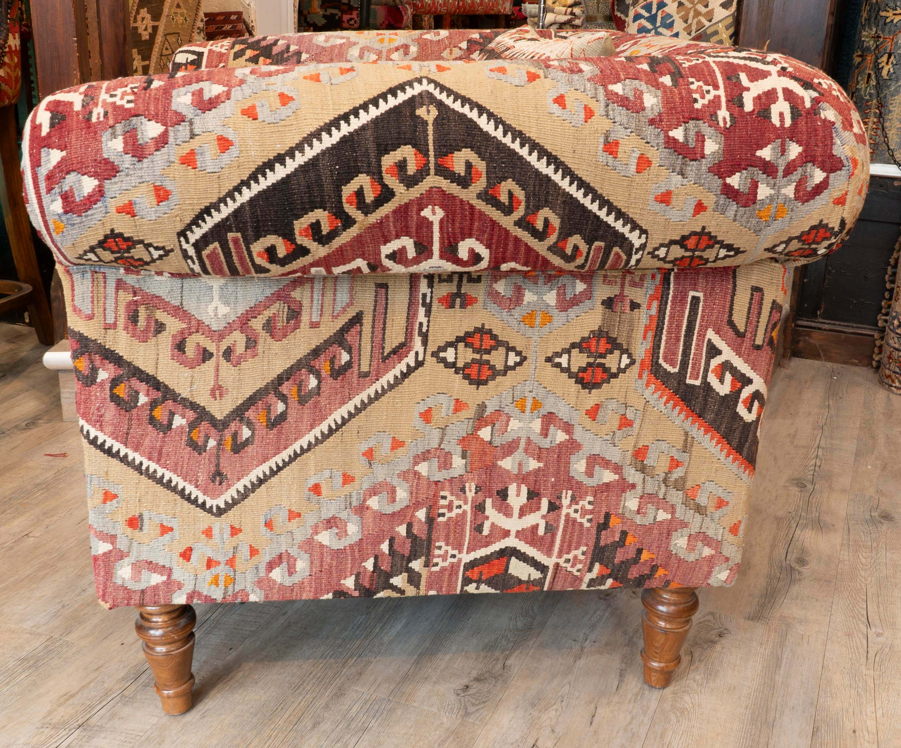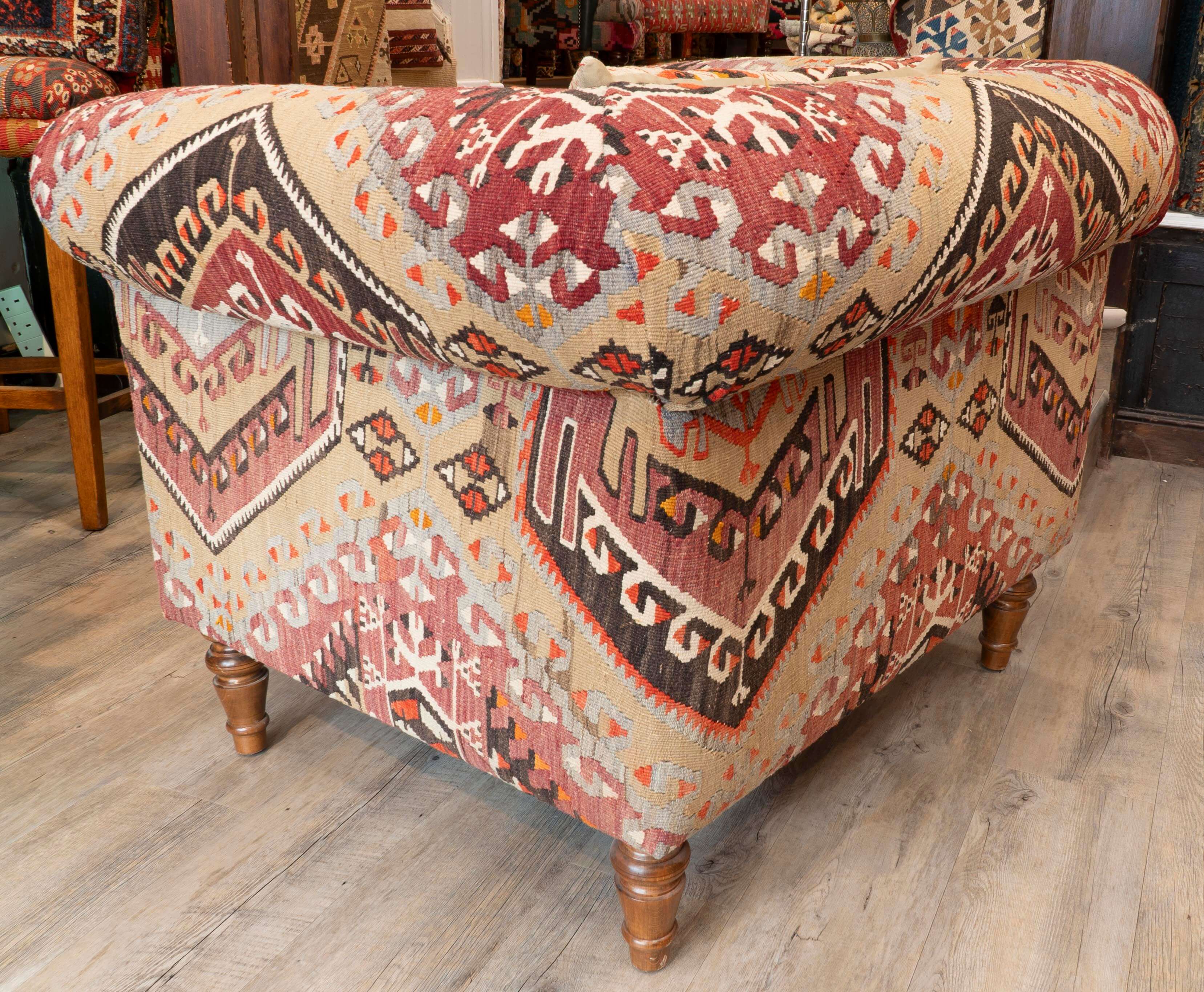 We're excited about our developing Kilim upholstered furniture collection. This new Chesterfield chair is yet another introduction to this exciting range. This timeless classic design can be easily incorporated into both traditional and contemporary homes. It is perfect for a curled-up reading chair, though it may be less suitable for someone who requires head support. The salvaged Kilim is bonded to a cotton backing fabric to stabilise the weave. Because each Kilim is unique, our upholsterer then determines the best way to cover the hardwood-framed chair. Often, the colours in old kilims have faded, and the fabric has softened, making them more malleable for working. The Kilim is cut sympathetically, ensuring the material is shown to the best advantage when planning the fabric layout on the chair. It's surprising how much Kilim is needed to cover a frame, and every bit is used, with the leftovers made into cushions and draft excluders.