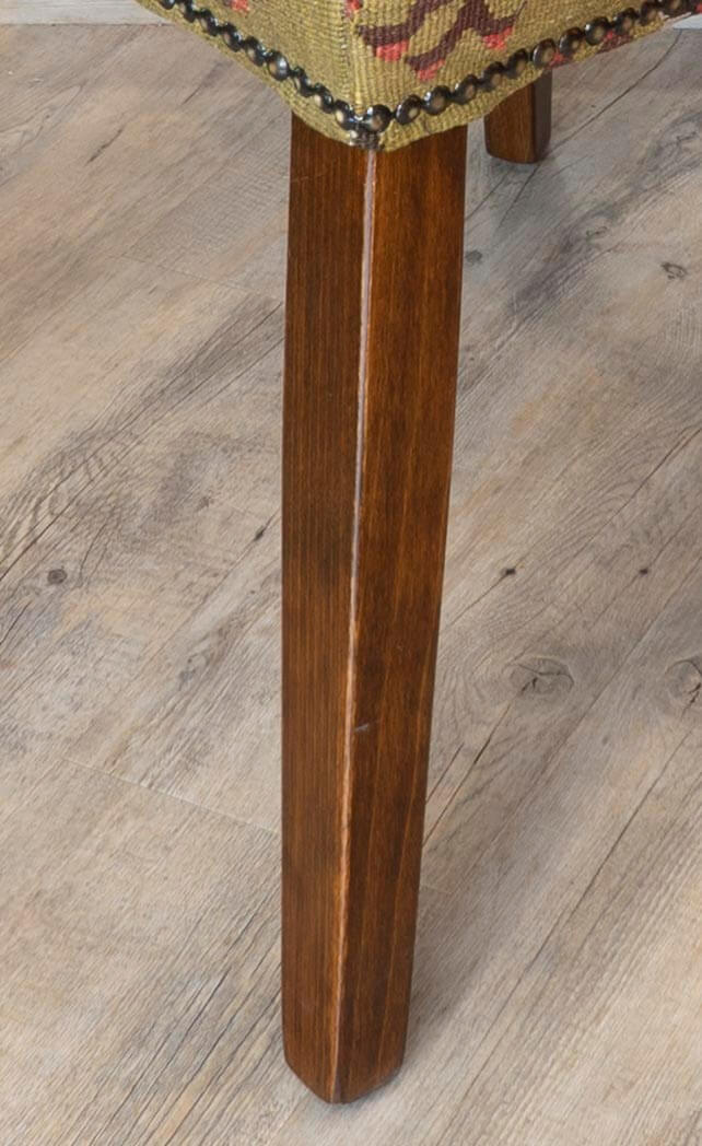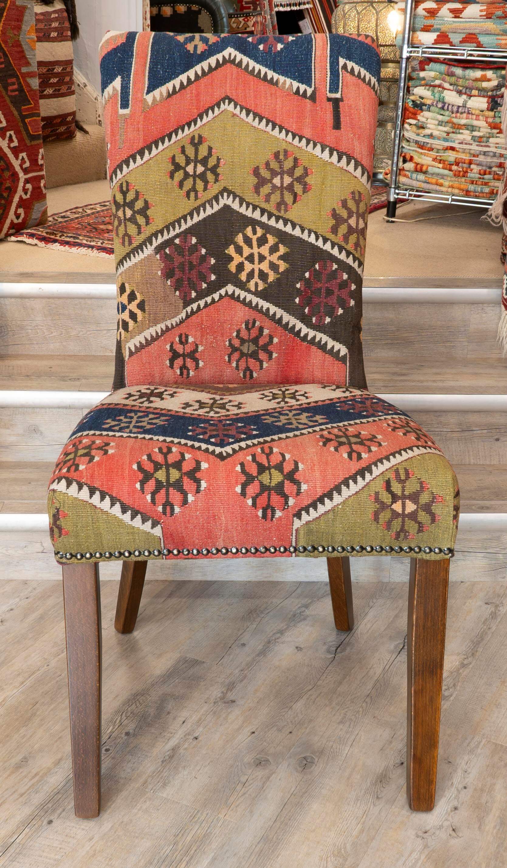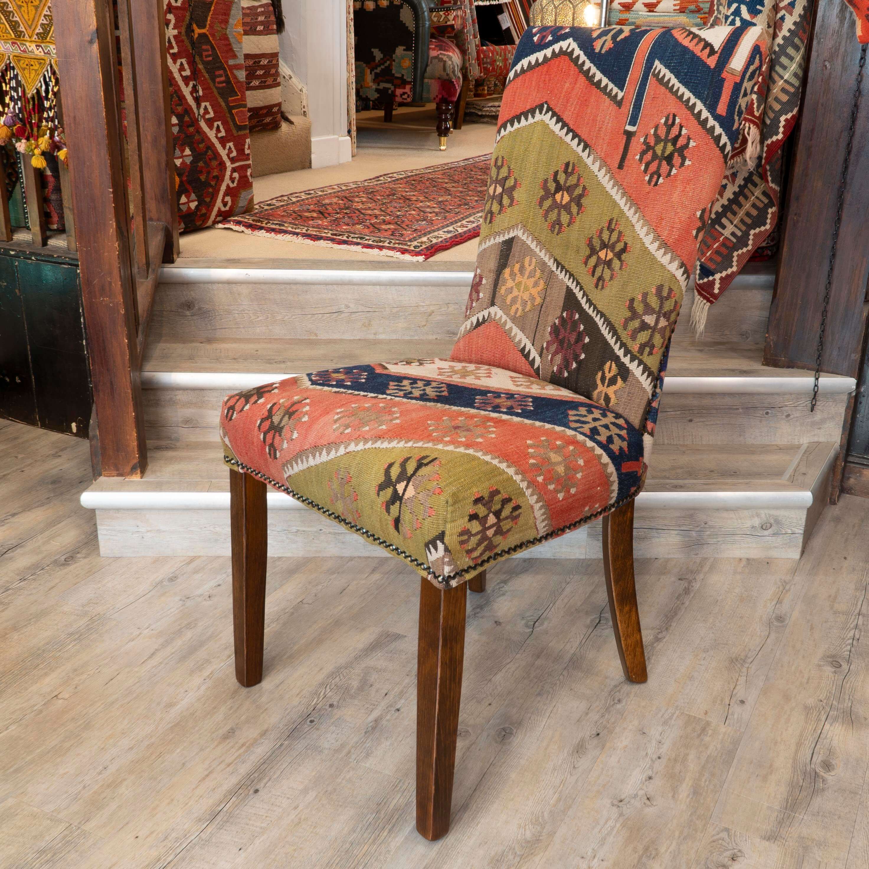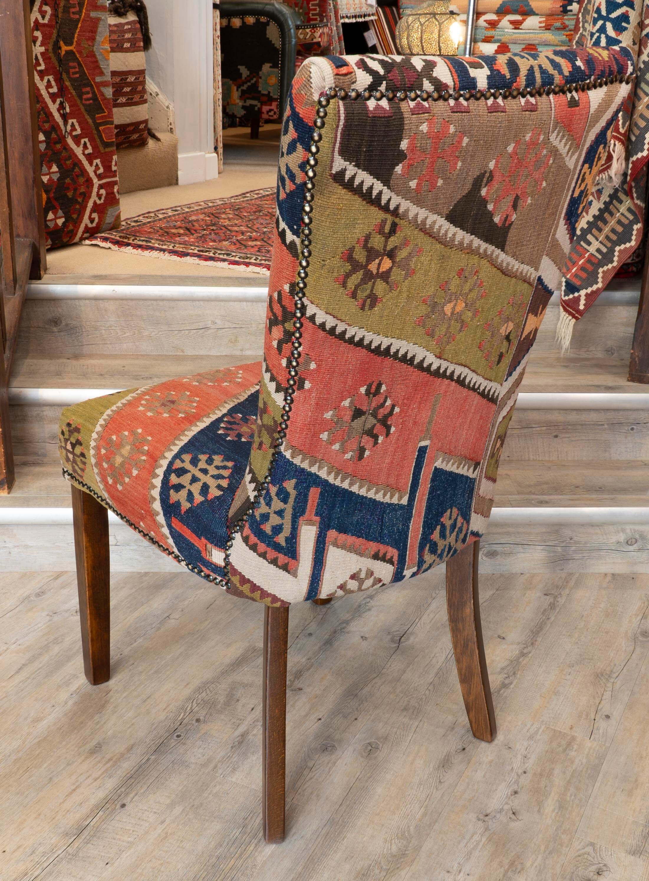 Our fully upholstered dining chairs are a timeless, classic country house design. These chairs has been covered in old Anatolian Kilim, which means it is unique; although we can make a set of chairs from one very large 'old kilim', each piece is individual and not identical; the colours will be softly faded, which can only be achieved with years of use and loving care. Often, the colours in the old kilims have toned down, and the fabric has softened, making it more malleable for working. The Kilim is cut as sympathetically as possible, ensuring that the material is shown to the best advantage possible when planning the layout of the fabric on the chair. It is surprising how much Kilim is needed to cover a frame, and every bit is used up, with the leftovers being made into cushions and draught excluded.