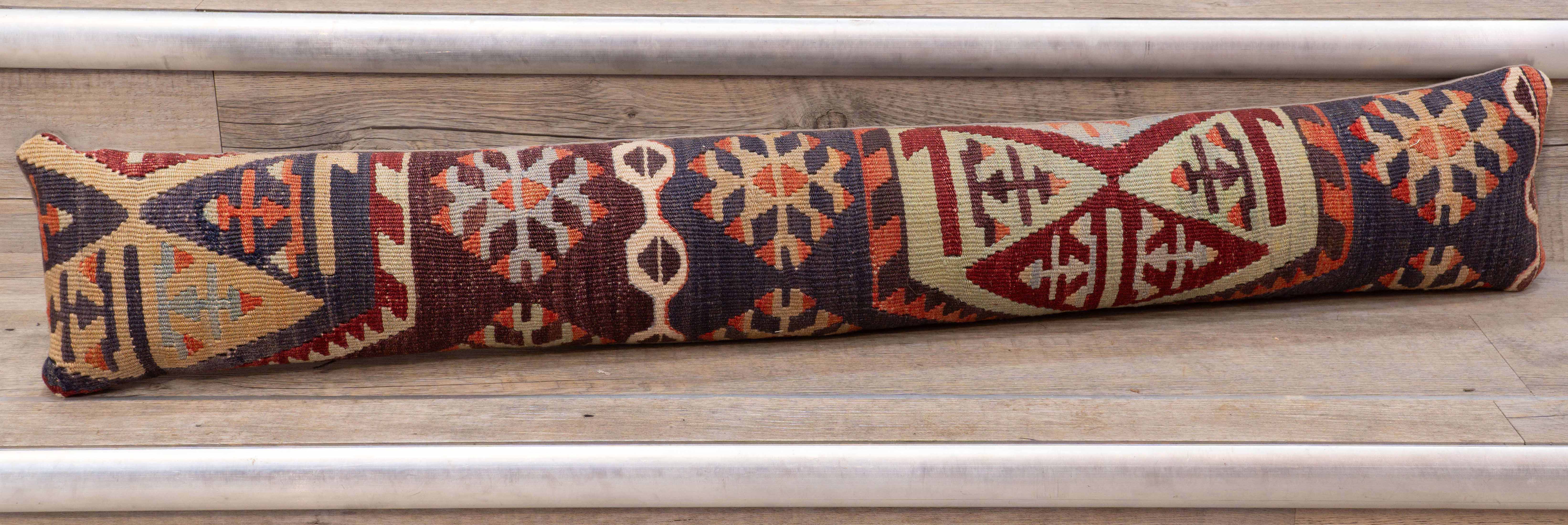 We are fortunate to have these draught excluders on the website; the old kilims are becoming harder to find and quite desirable. This lovely draught excluder is made from a salvaged piece of Turkish Kilim. It is single-faced, with a faux-suede/linen backing and fibre fill. Each draught excluder is unique and not repeatable.