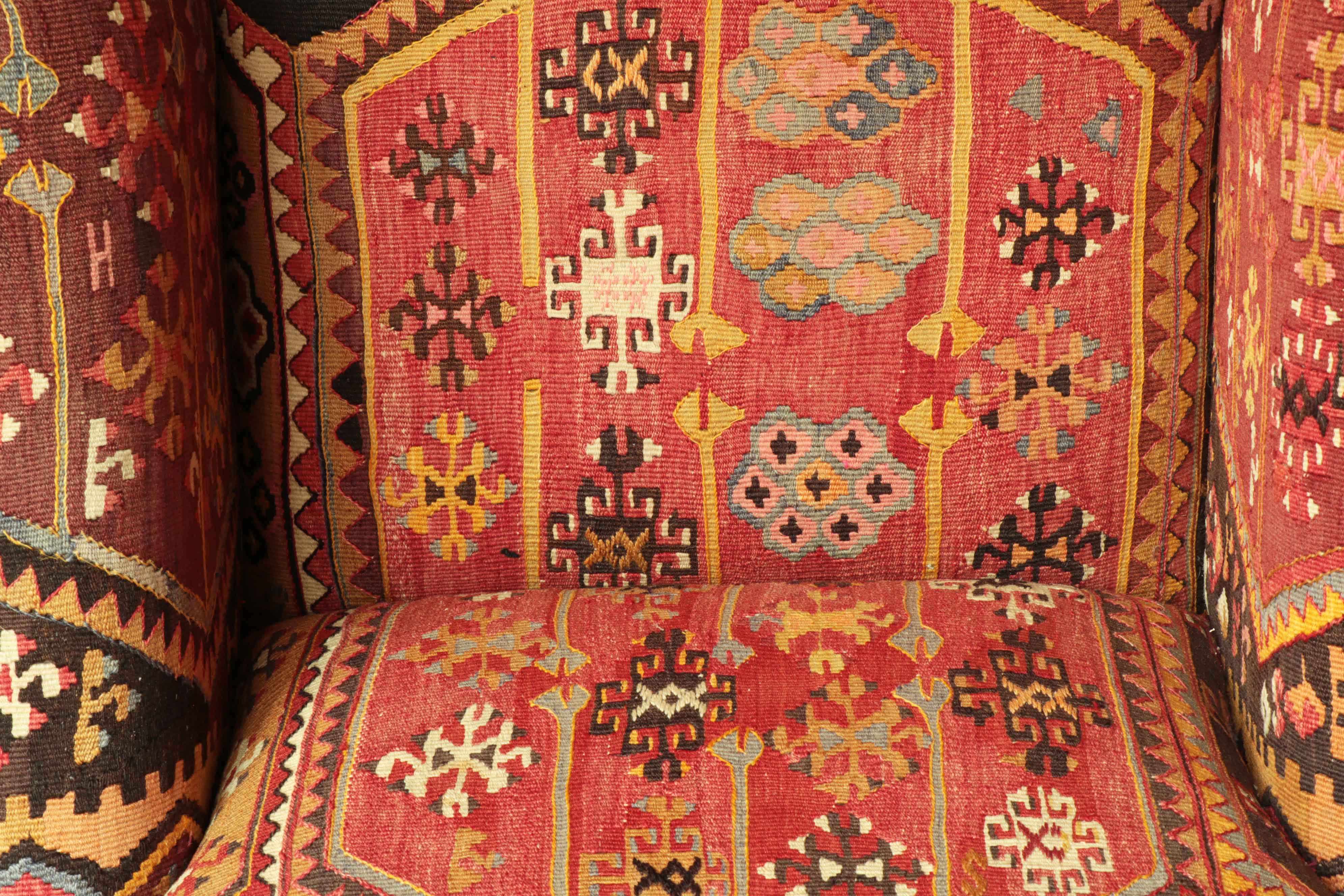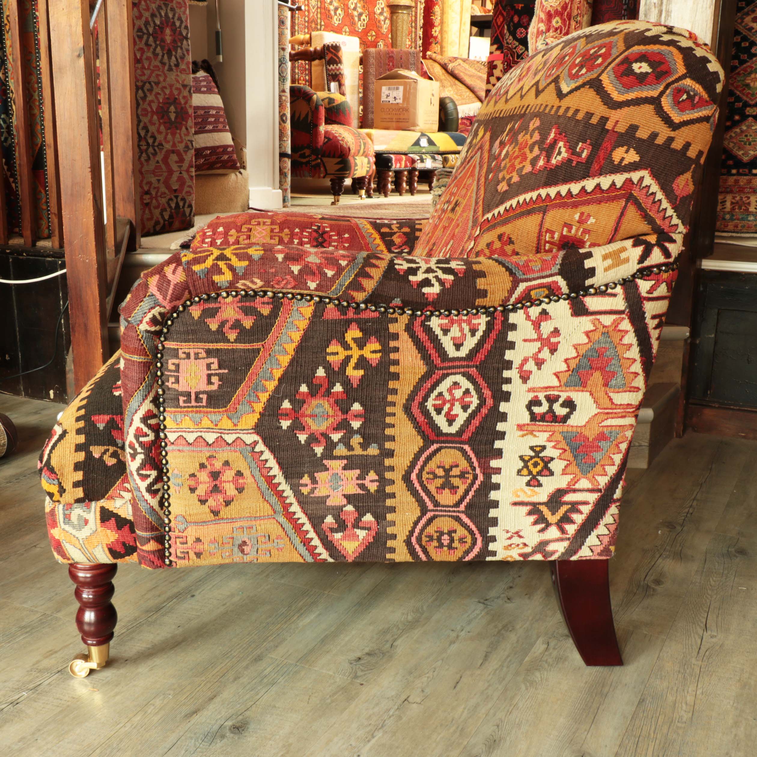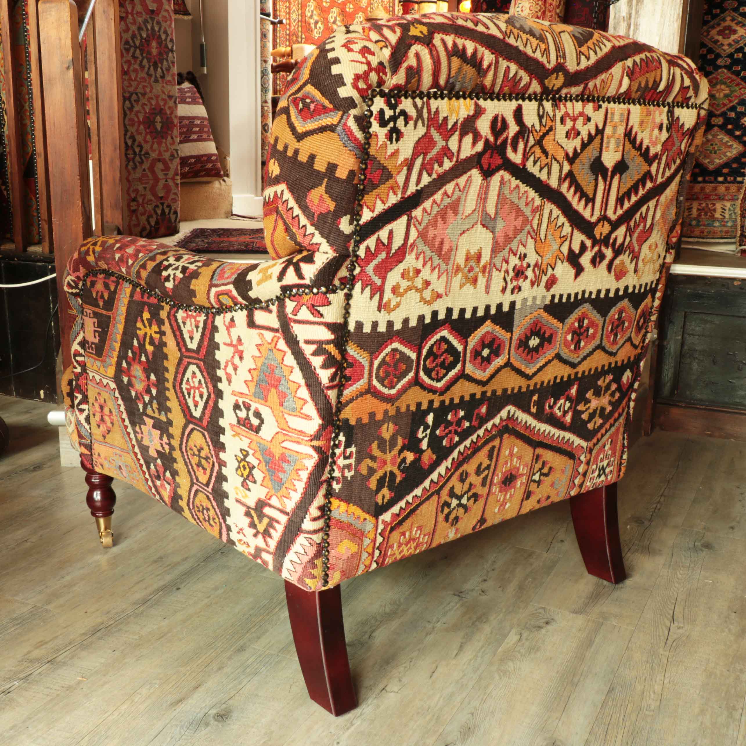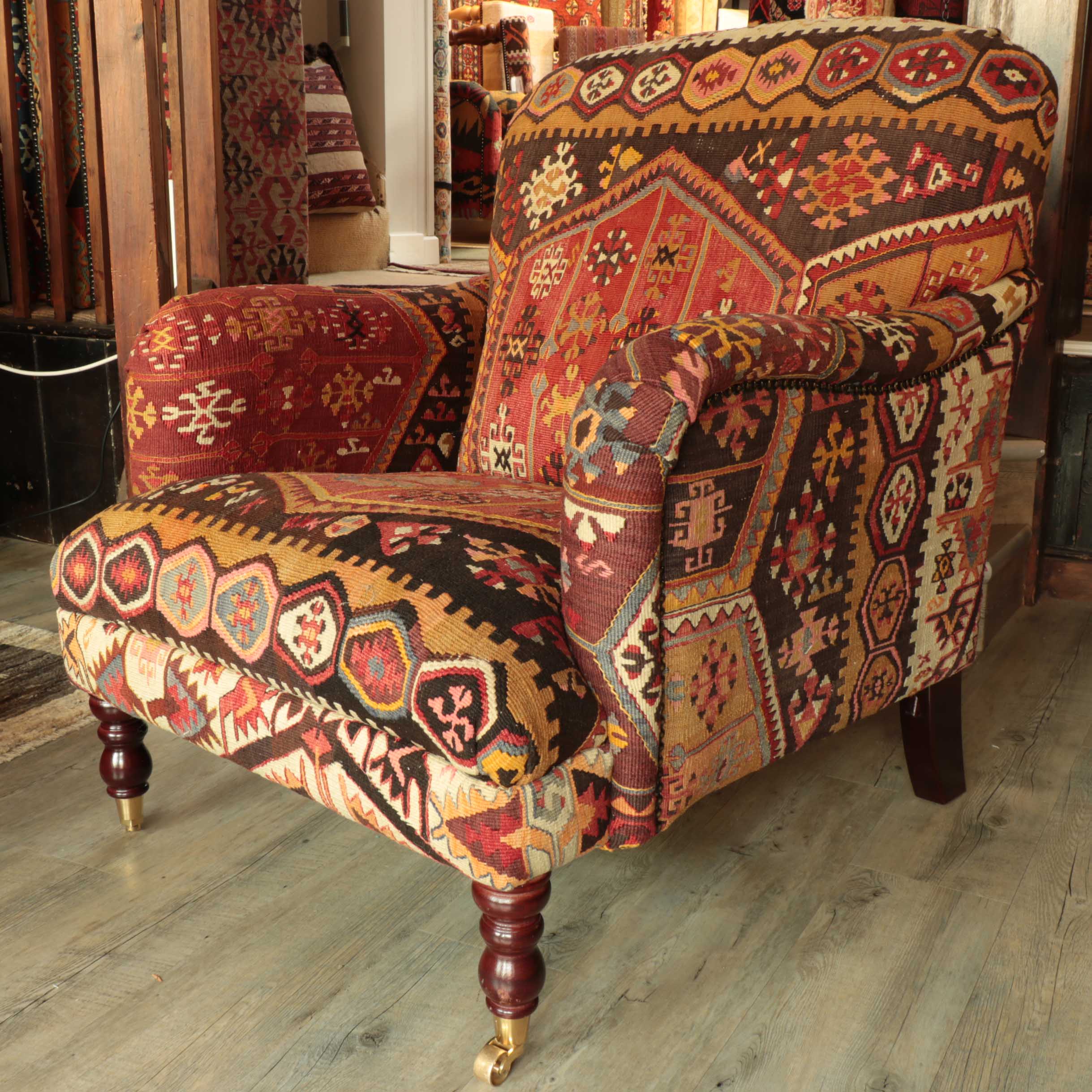 The Howard chair is a timeless, classic country house design. This chair has been covered in old Anatolian Kilim, which means it is colourful, comfortable and durable. Often, the colours in the old kilims have toned down, and the fabric has softened, making it more malleable for working. The Kilim is cut as sympathetically as possible, ensuring that the material is shown to the best advantage possible when planning the layout of the fabric on the chair. It is surprising how much Kilim is needed to cover a frame, and every bit is used up, with the leftovers being made into cushions and draught excluded.