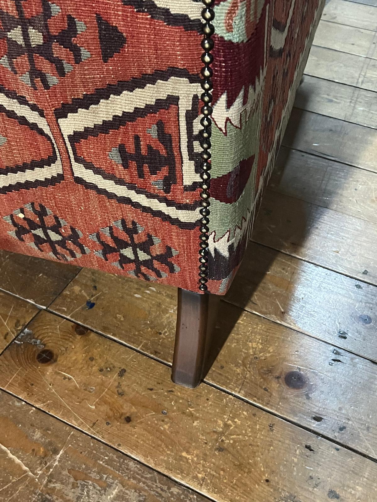 We're excited about our developing Kilim upholstered furniture collection. This new Lenny chair is yet another introduction to this exciting range. The salvaged Kilim is bonded to a cotton backing fabric to stabilise the weave. As each Kilim is unique, our upholsterer then searches for the best way to cover the hardwood-framed chair. Often, the colours in old kilims have faded, and the fabric has softened, making them more malleable for working. The Kilim is cut sympathetically, ensuring the material is shown to the best advantage when planning the fabric layout on the chair. It's surprising how much Kilim is needed to cover a frame, and every bit is used, with the leftovers made into cushions and draft excluders.