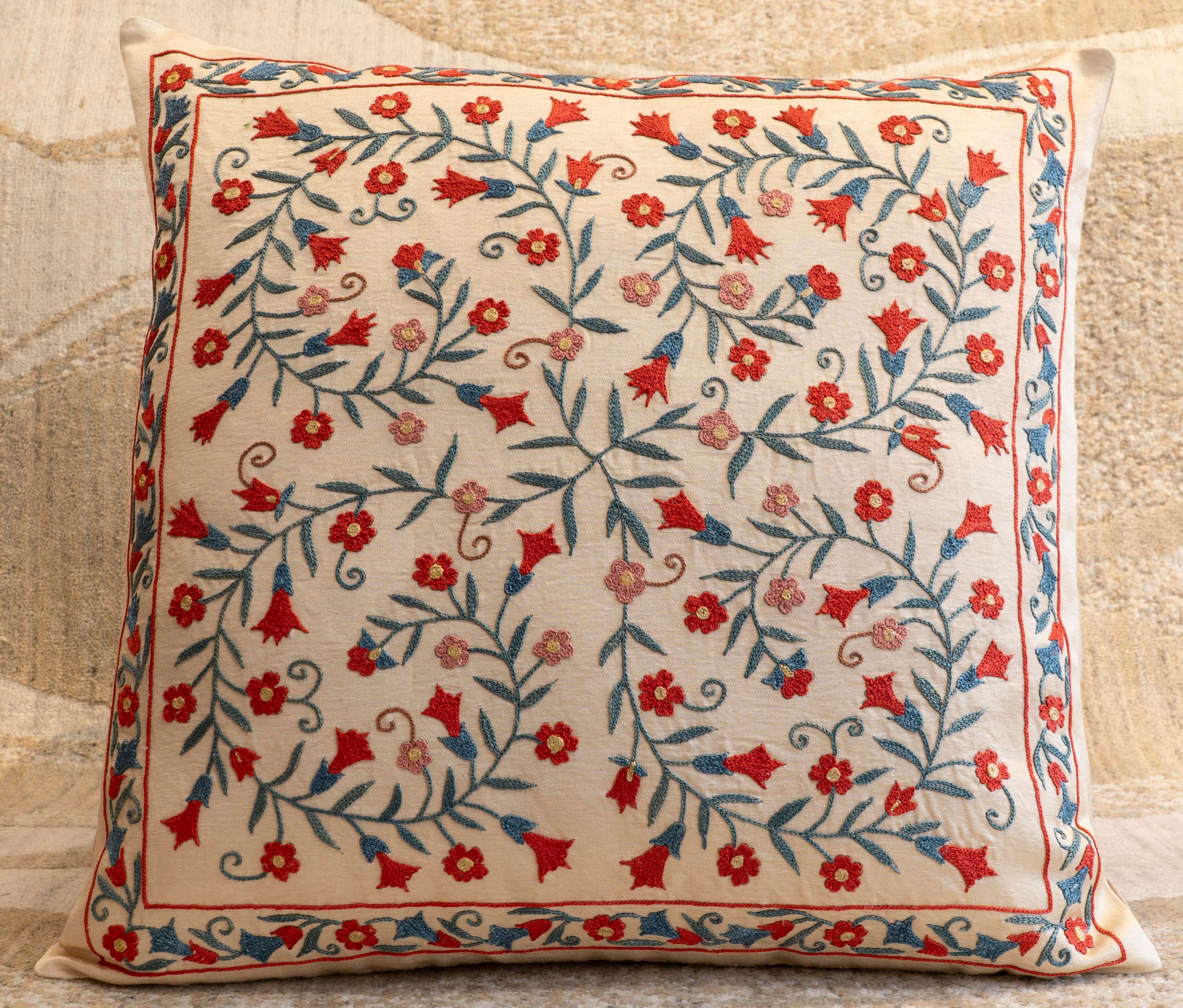 The term 'Suzani' means needlework; this beautiful craft is world-renowned and synonymous with the fabulous embroideries of Uzbekistan in Central Asia. It is pleasing to learn that ancient, highly skilled craft is resurgent. The suzani embroidery threads should be silk, using two traditional stitches, 'Basma stitch', sometimes called Bukhara couching, and less often 'chain' stitching. In neither case, an unbelievable amount of time and care goes into making each piece. This collection is really for the connoisseur. The front of the cushion is made of silk with hand-embroidered work, which is very finely produced in silk. Many of these cushions...