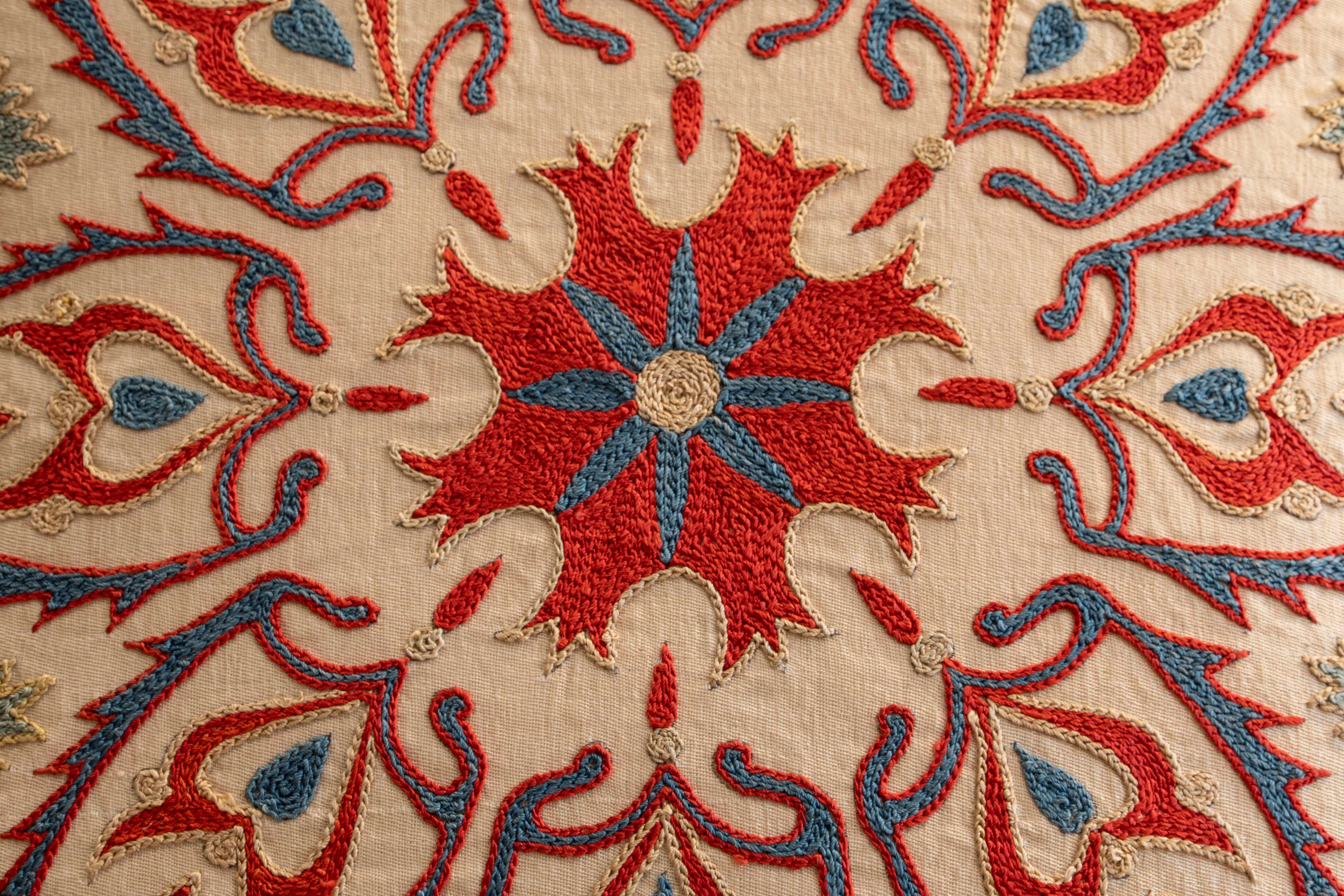 The term 'Suzani' means needlework; this beautiful craft is world-renowned and synonymous with the fabulous embroideries of Uzbekistan in Central Asia. It is pleasing to learn that ancient, highly skilled craft is resurgent. The suzani embroidery threads should be silk, using two traditional stitches, 'Basma stitch', sometimes called Bukhara couching, and less often 'chain' stitching. In neither case, an unbelievable amount of time and care goes into making each piece.