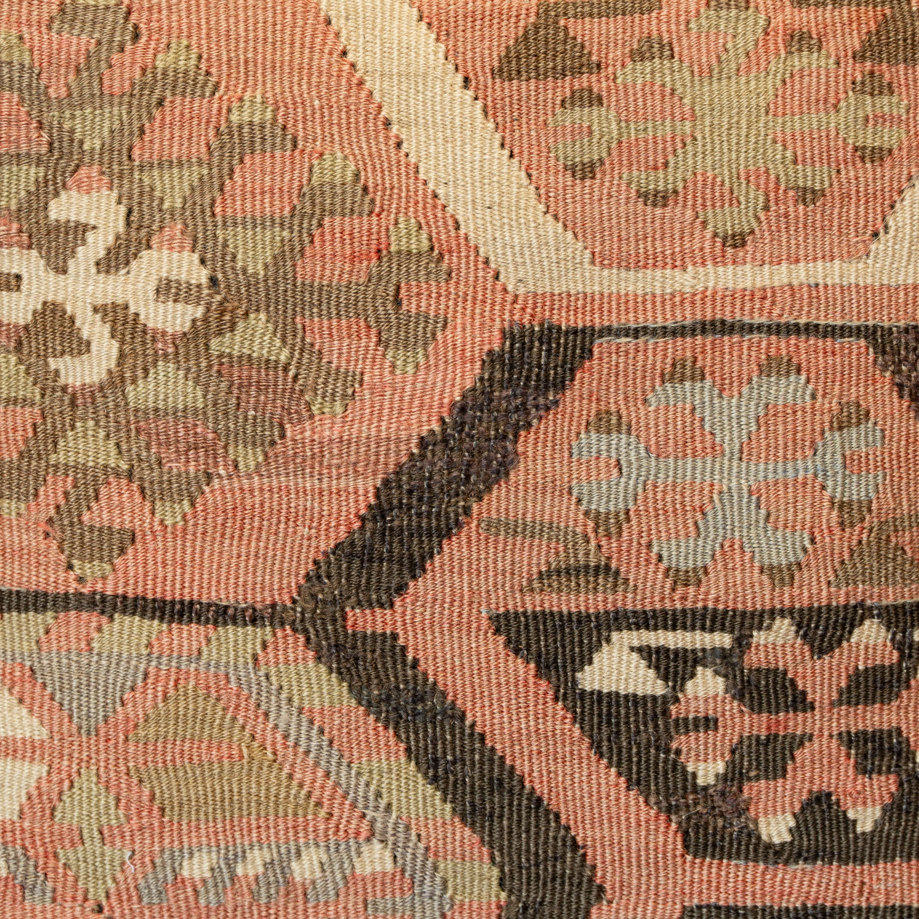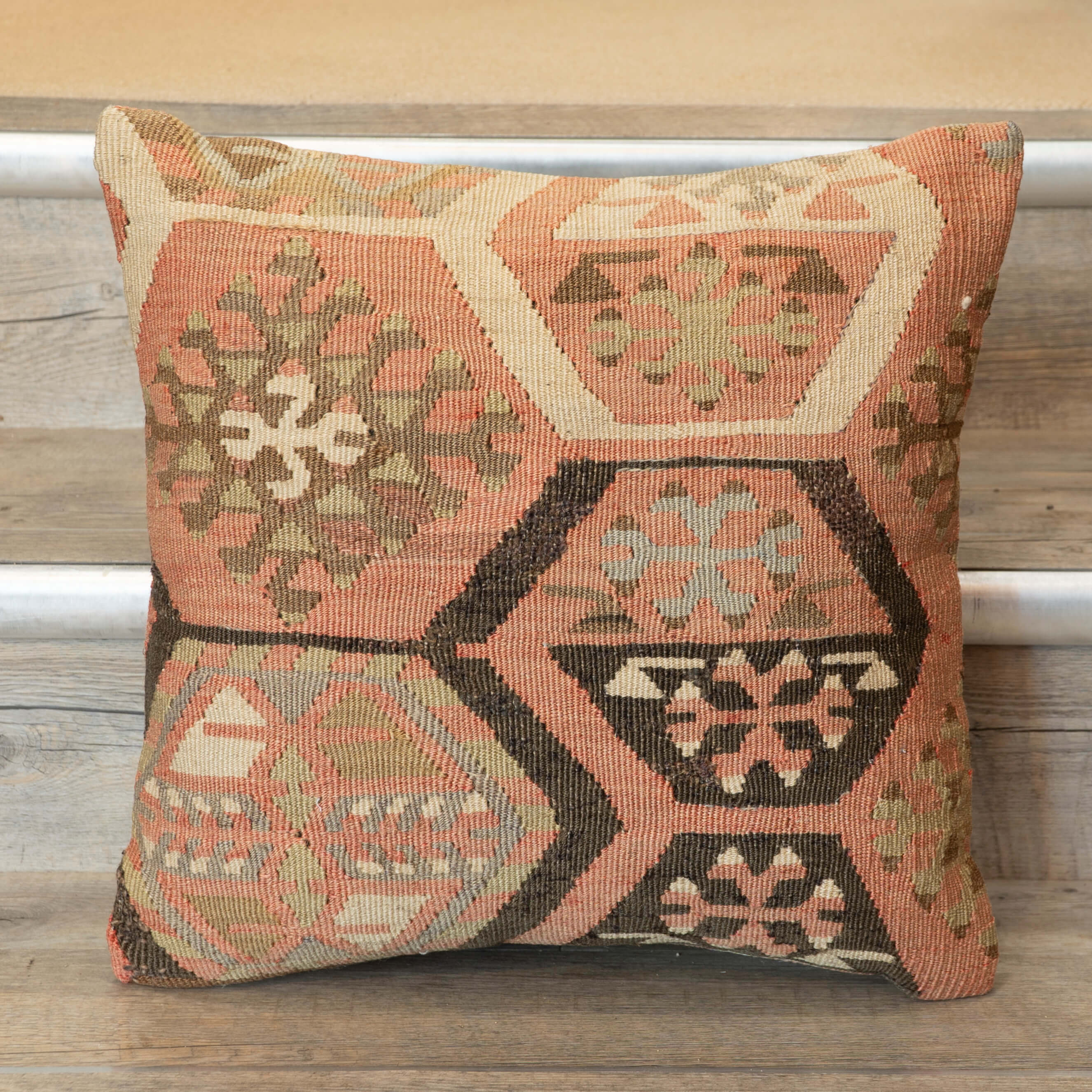 This new collection of cushions is produced from vintage or Antique kilim, which has been washed, cleaned and repaired (where necessary). The largest pieces are used for items such as sofas, chairs, and benches before utilizing the small cuts for cushions and draught excluders. Waste should be kept to an absolute minimum to preserve as much old kilim as possible. In addition, the cushions are fibre-filled, making them more suitable for individuals with allergies to feather fillings. These cushions are from very fine kilims and are the best we have seen. Product size: 40 x 40cm (1'4 x 1'4)