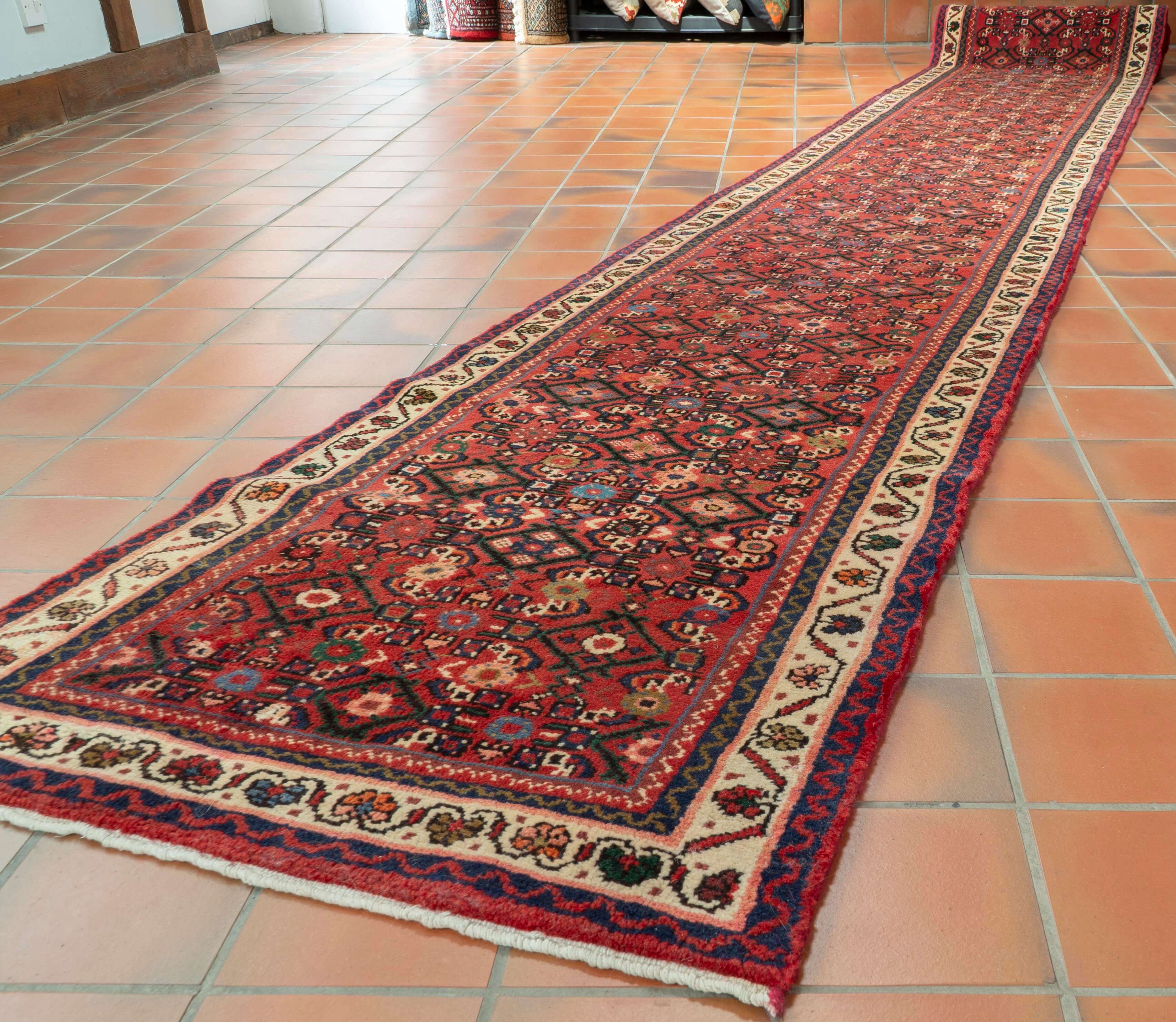Very rarely do we find a runner as long and narrow as this that is good for quality, design and colour. This piece was made in Hossienabad, one of the many villages that produce rugs in the Hamadan region. The wool pile is fairly thick, very practical, and hard-wearing. The background colour is a soft red, with a narrow cream border and dark green pattern detail.