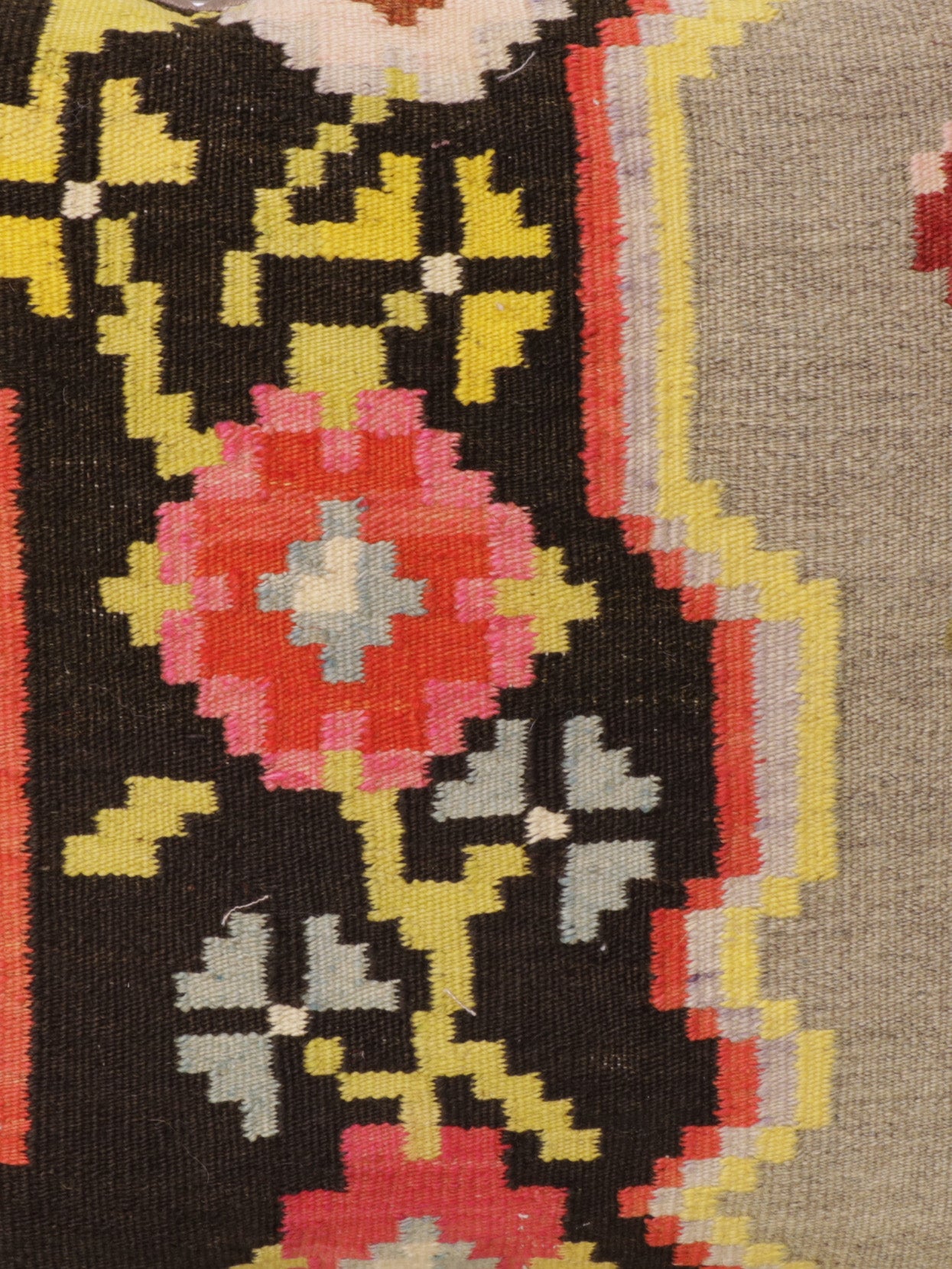 Our collection of kilim cushions offers great colours and texture. The pieces are often taken from larger kilim so that the pattern may be cut in unusual and interesting ways. In addition, the cushions are fibre-filled, making them more suitable for individuals who have allergies to feather fillings. This one has very soft muted colourings and is from Moldova.  Product size: 50 x 50cm (1'8 x 1'8)