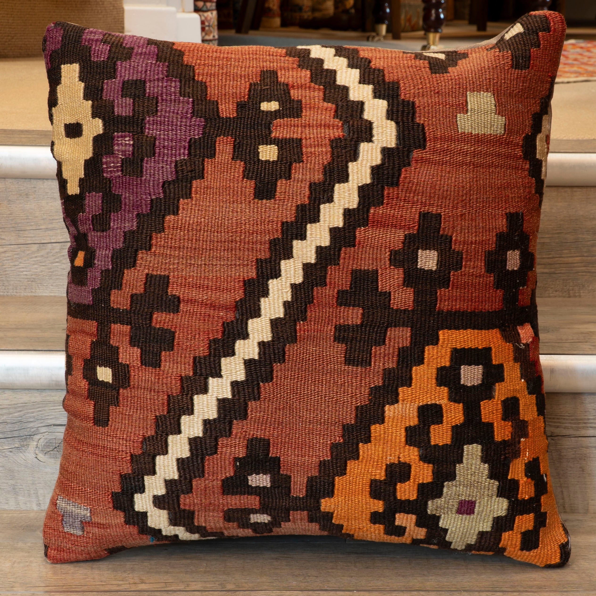 Our collection of kilim cushions offers great colours, designs and textures. The pieces are often taken from a larger old, sometimes antique kilim, cleaned and sorted to repurpose and salvage a treasured fabric that otherwise could be lost. The pattern may be cut in unusual and interesting ways to ensure as much of this precious resource can be saved. In addition, the cushions are fibre-filled, making them more suitable for individuals with allergies to feather fillings.  Product size: 50 x 50cm (20" x 20")