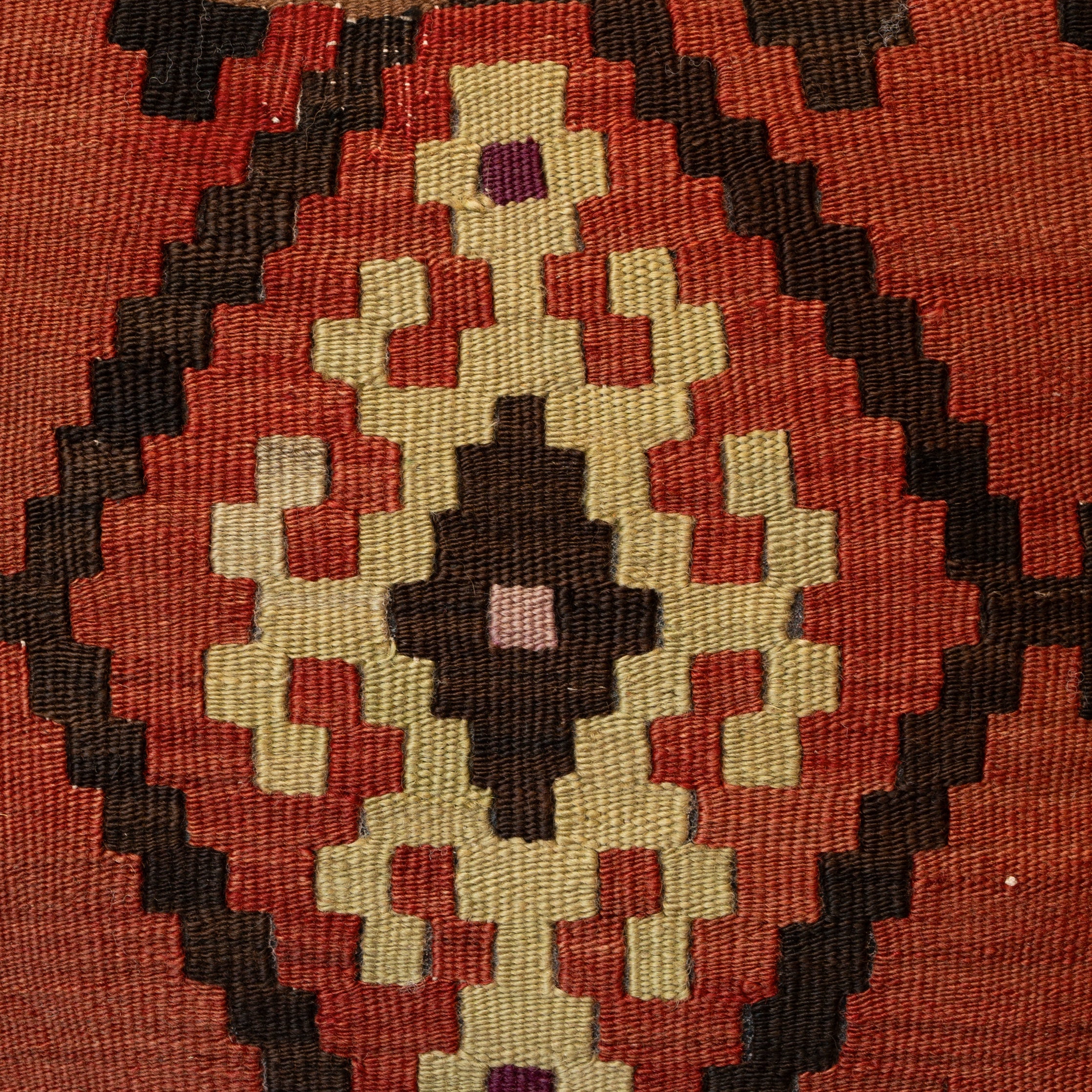 Our collection of kilim cushions offers great colours, designs and textures. The pieces are often taken from a larger old, sometimes antique kilim, cleaned and sorted to repurpose and salvage a treasured fabric that otherwise could be lost. The pattern may be cut in unusual and interesting ways to ensure as much of this precious resource can be saved. In addition, the cushions are fibre-filled, making them more suitable for individuals with allergies to feather fillings.  Product size: 50 x 50cm (20" x 20")