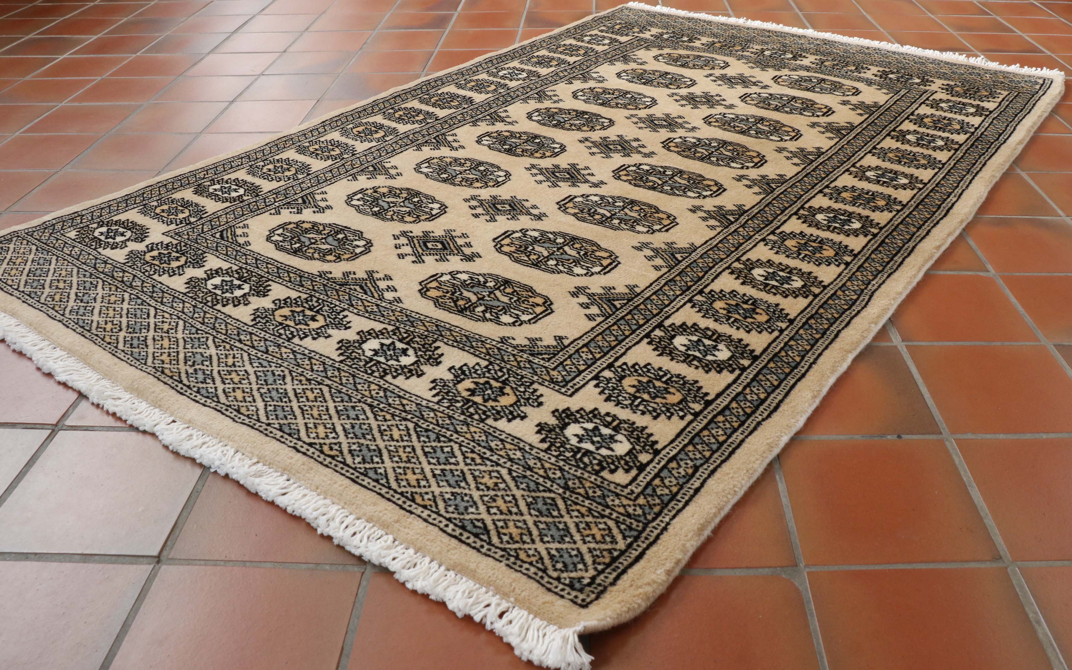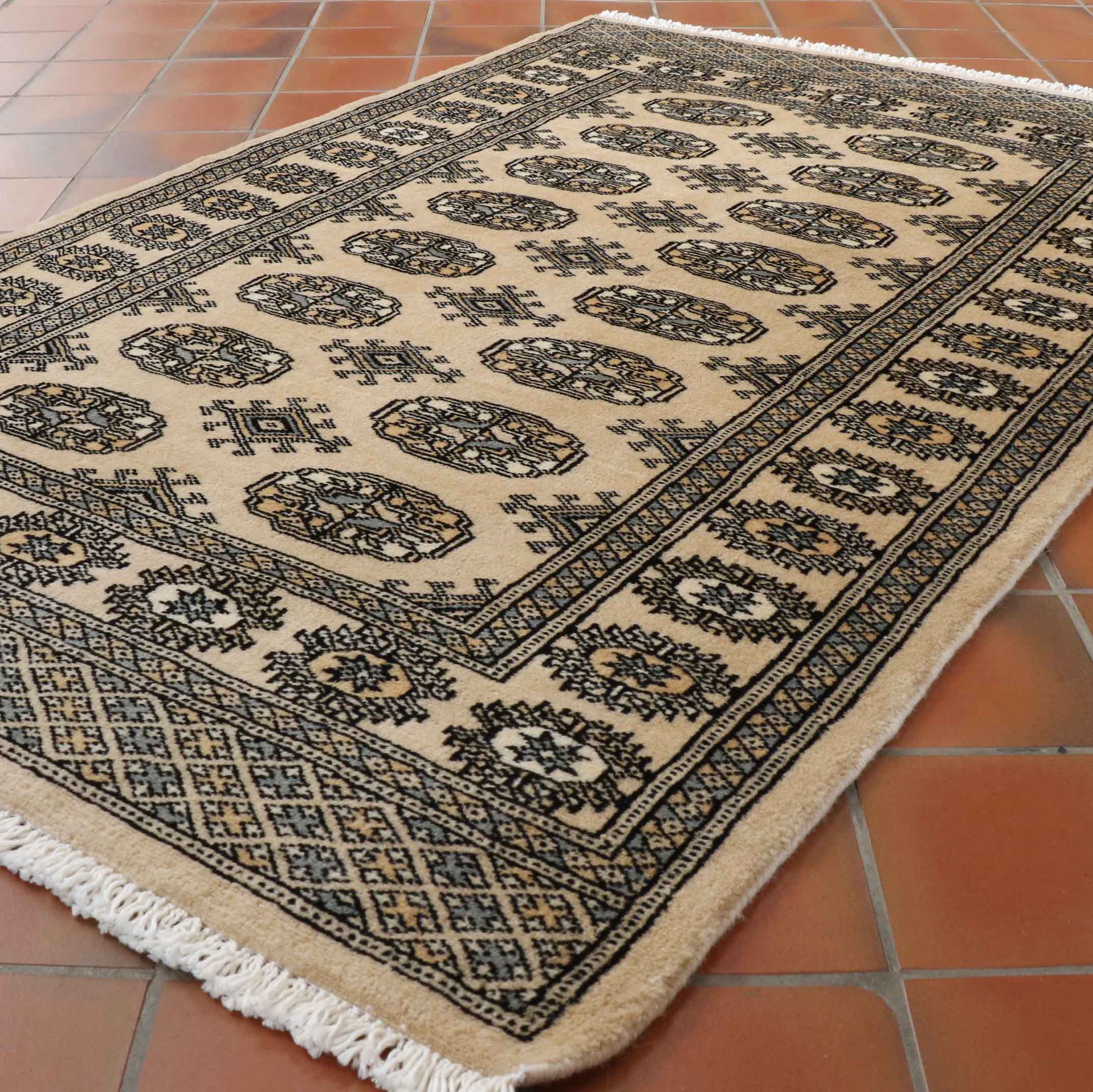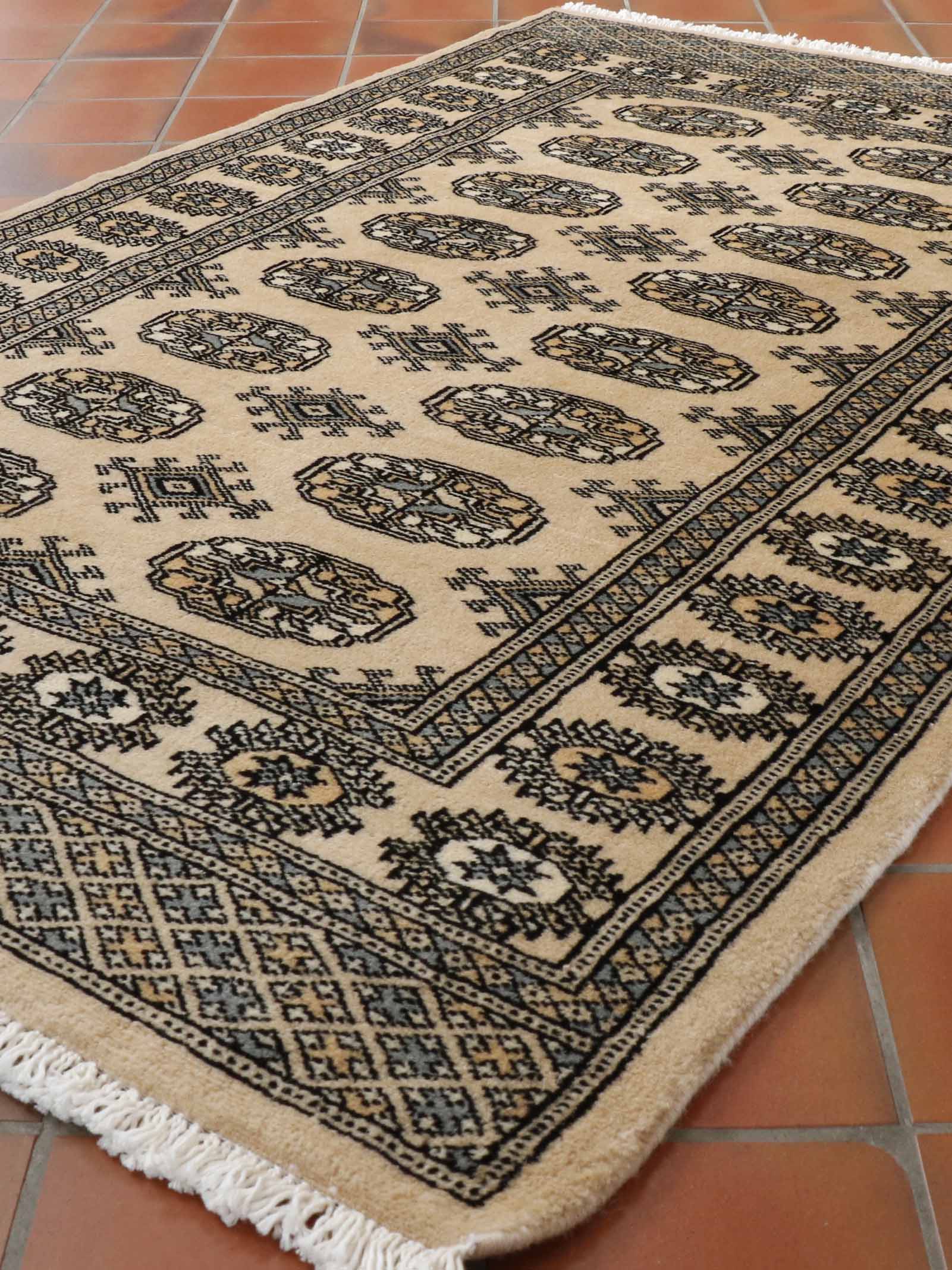 With a beige background, this Pakistan Bokhara rug is finely knotted in soft, silky, smooth wool. It is handmade using fine wool knotted onto a cotton warp and weft. The Bokhara rugs are incredibly good value—this is a handmade rug at an affordable price. They come in a range of sizes and colours.