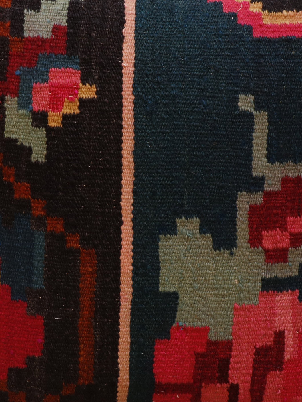 Our collection of kilim cushions offers great colours and texture. The pieces are often taken from larger kilim, so the pattern may be cut in unusual and interesting ways. The fibre-filled cushions make them more suitable for individuals with allergies to feather fillings. This one has very soft, muted colourings and is from Moldovia.