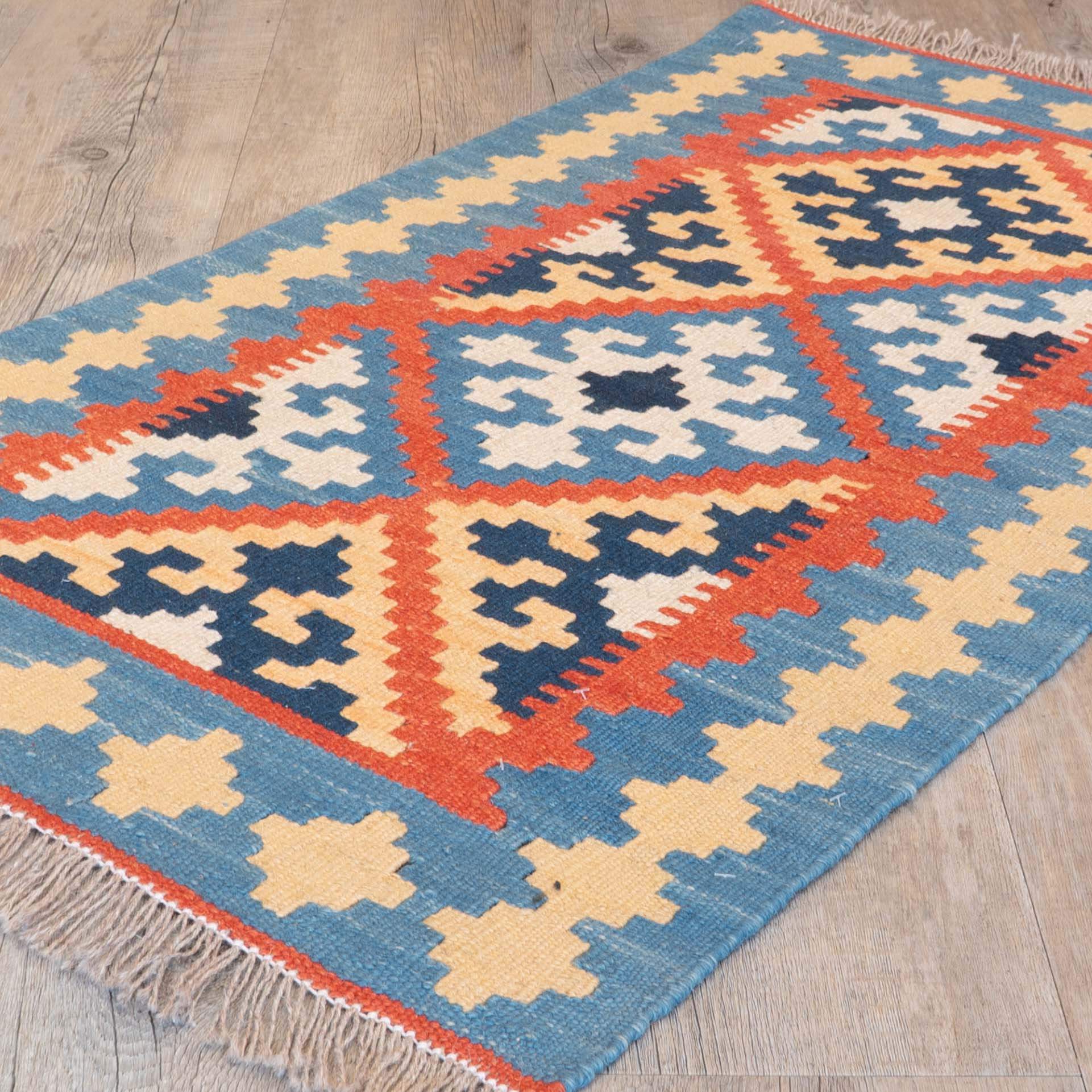 This authentic Qashqai Kelim showcases traditional craftsmanship with a striking palette of blue, green and terracotta. Handwoven from 100% wool, this reversible piece offers versatility and durability, letting you display either side based on your décor. The geometric patterns characteristic of Qashqai design bring cultural heritage and timeless elegance to any interior. Ideal for those seeking a genuine, functional textile with genuine artisanal appeal.
