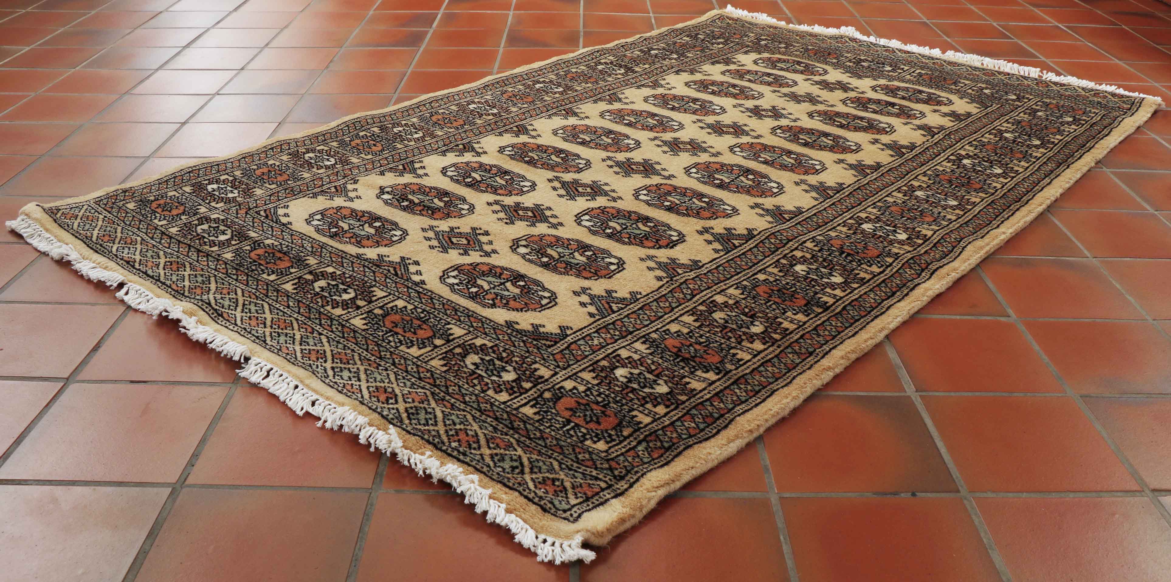 Pakistan Bokhara rugs are hand-woven using soft wool, sometimes imported from New Zealand, on a white cotton warp and weft. This gives the carpet a property similar to silk in touch but with a much longer pile. These rugs offer great value for money as production is considered easier than other carpet manufacturing processes.
