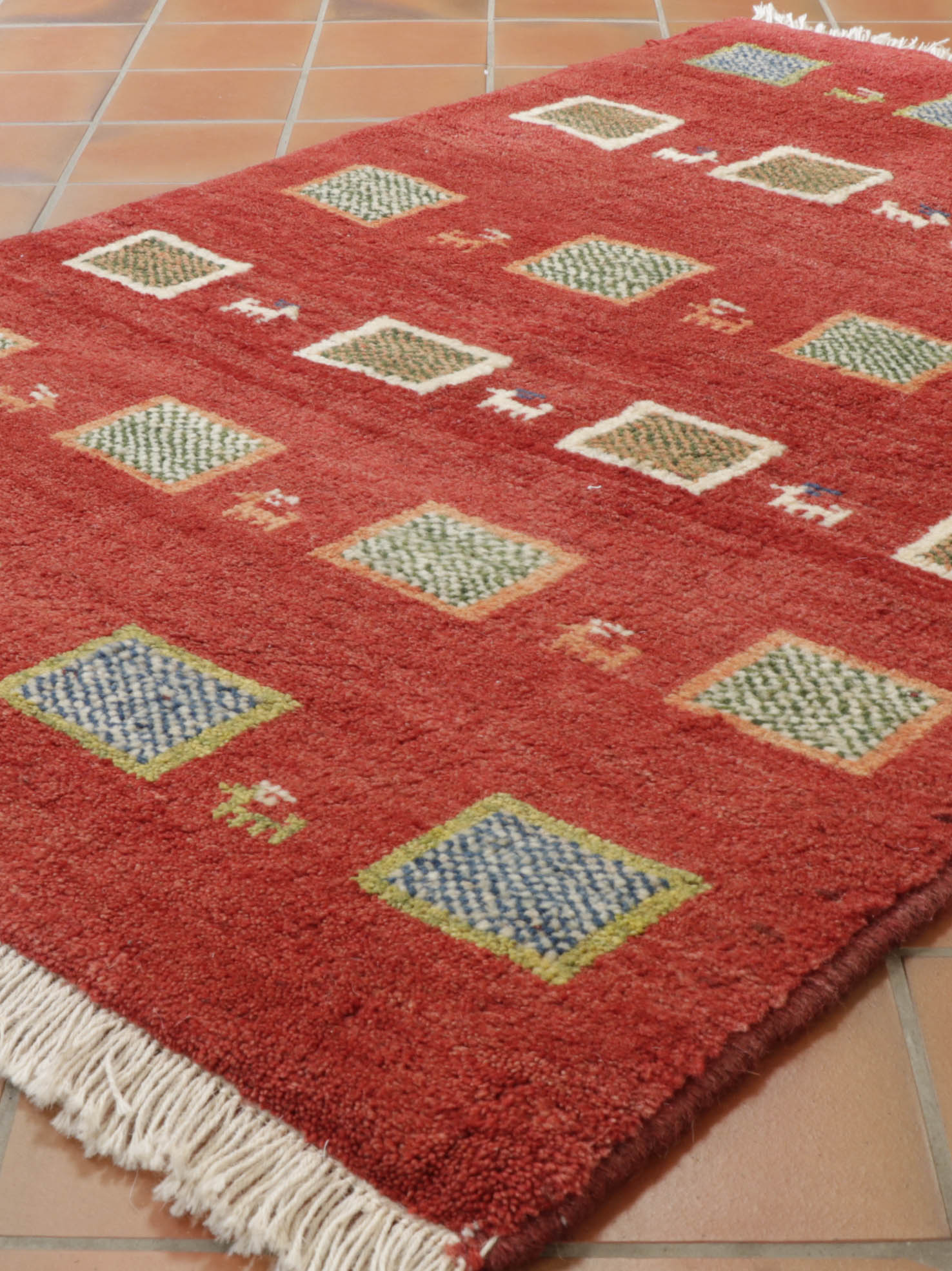 These classic old Persian Gabbeh rugs are little treasures of rustic simplicity. However, the hand-knotted wool they are made with has such substance, character, and even some of the spirit of the women that make them. The rugs have been made using the same methods by nomadic tribes for centuries. The women sit and spin the long-ply wool by hand and dye it using natural products around them, such as walnut husks, pomegranate rind, tree bark, wildflowers and berries. The design is often very abstract, with open fields of colour and sometimes an element of fun. These pieces are very different from the modern-day Gabbeh rugs. They may be between 20/30 years old and with no sign of wear in terms of age. They are often used in their tents by the people who make them. There are many different Gabbeh rugs, but there is something very genuine and traditional about these works of art.