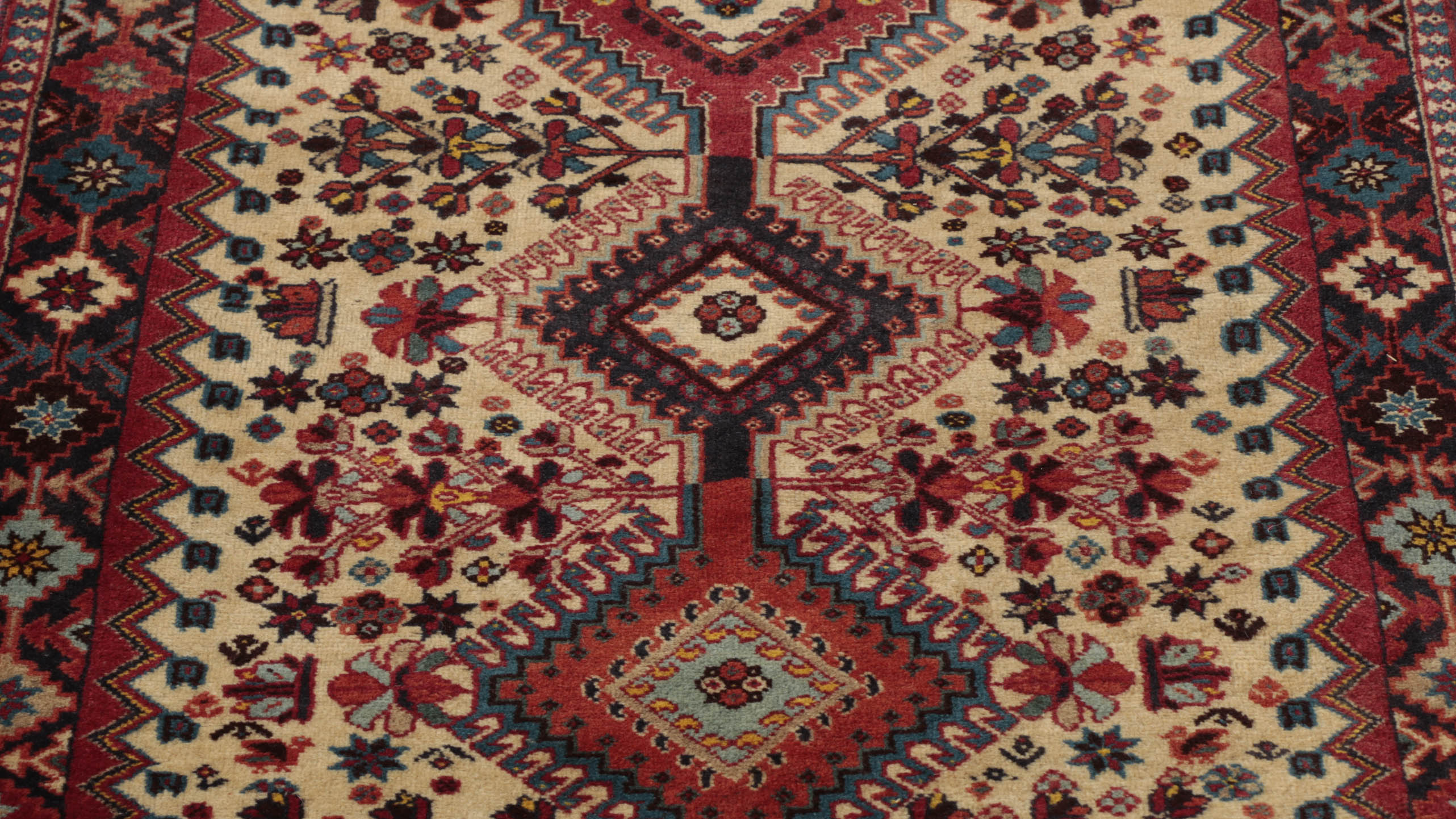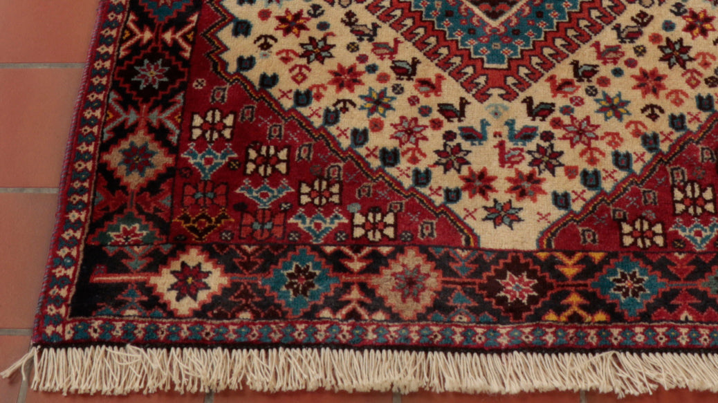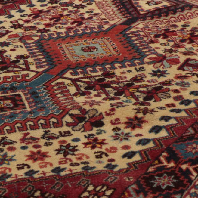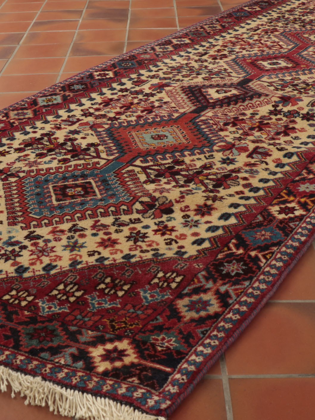 Using terracotta or rust colourings with different shades of blue and cream, Persian Yallameh rugs are always made with a distinctive hooked diamond design. Unfortunately, this lovely village piece is becoming harder to find—the geometric designs, with their dogtooth-shaped outer contrast, superbly complement the delightful floral images. Two shades of blue, in particular, make this rug very appealing to me. I hope you love it as much as I do.