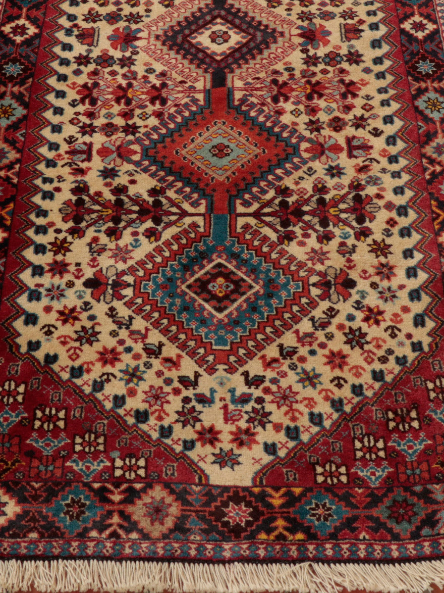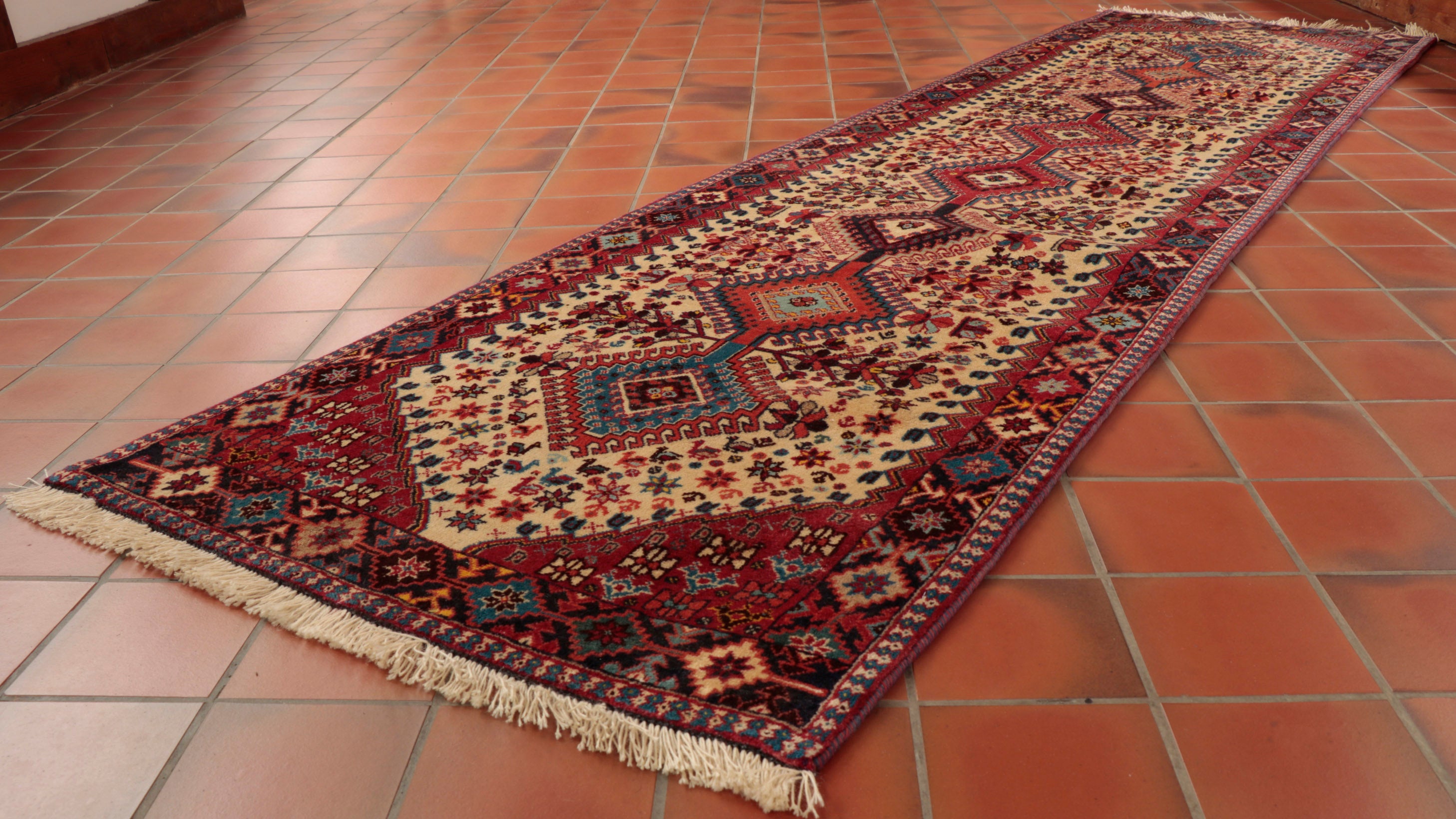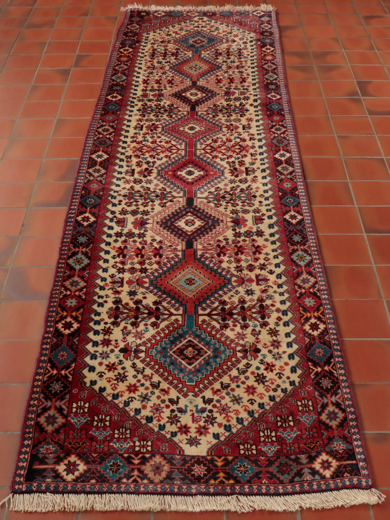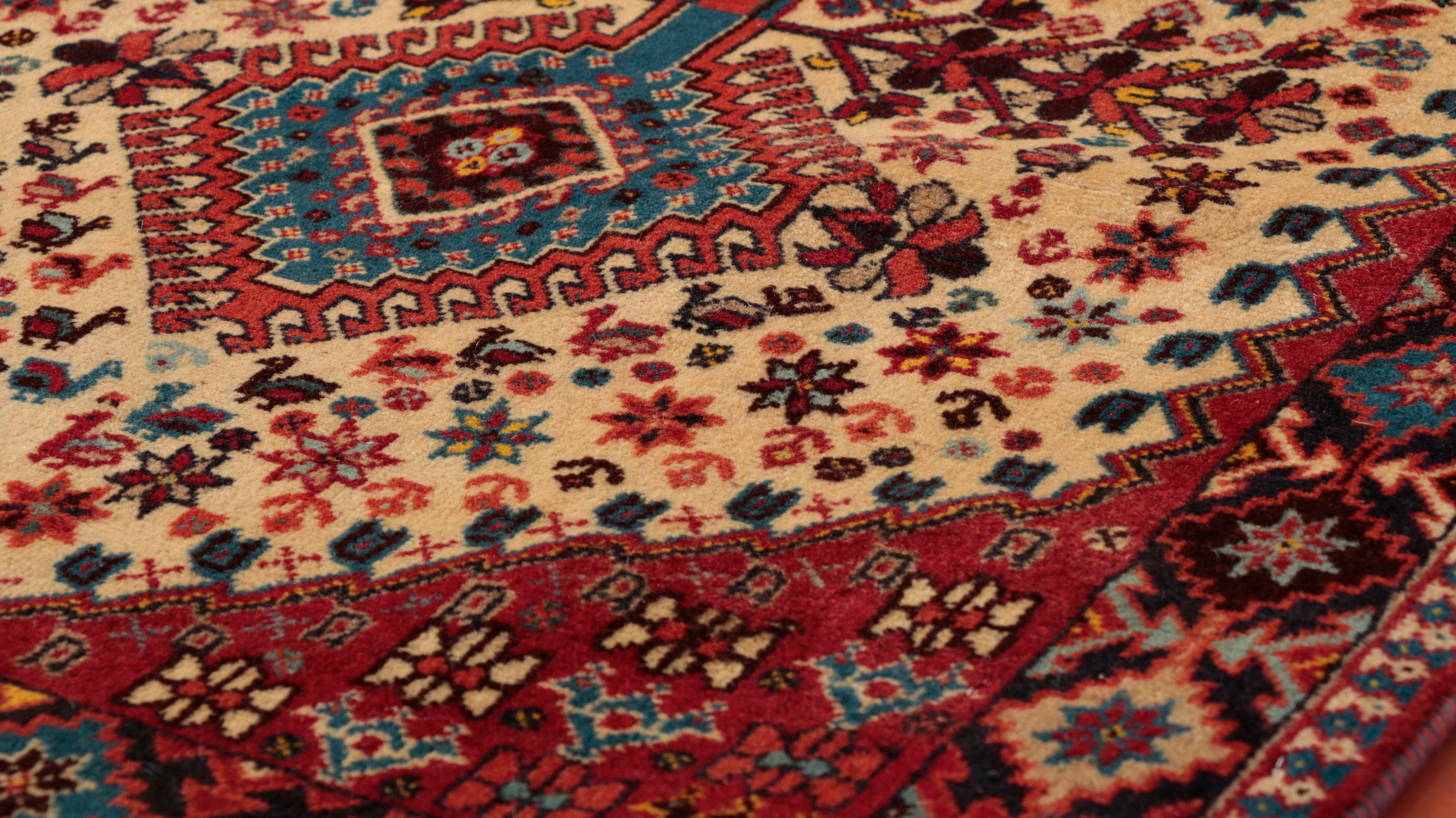 Using terracotta or rust colourings with different shades of blue and cream, Persian Yallameh rugs are always made with a distinctive hooked diamond design. Unfortunately, this lovely village piece is becoming harder to find—the geometric designs, with their dogtooth-shaped outer contrast, superbly complement the delightful floral images. Two shades of blue, in particular, make this rug very appealing to me. I hope you love it as much as I do.