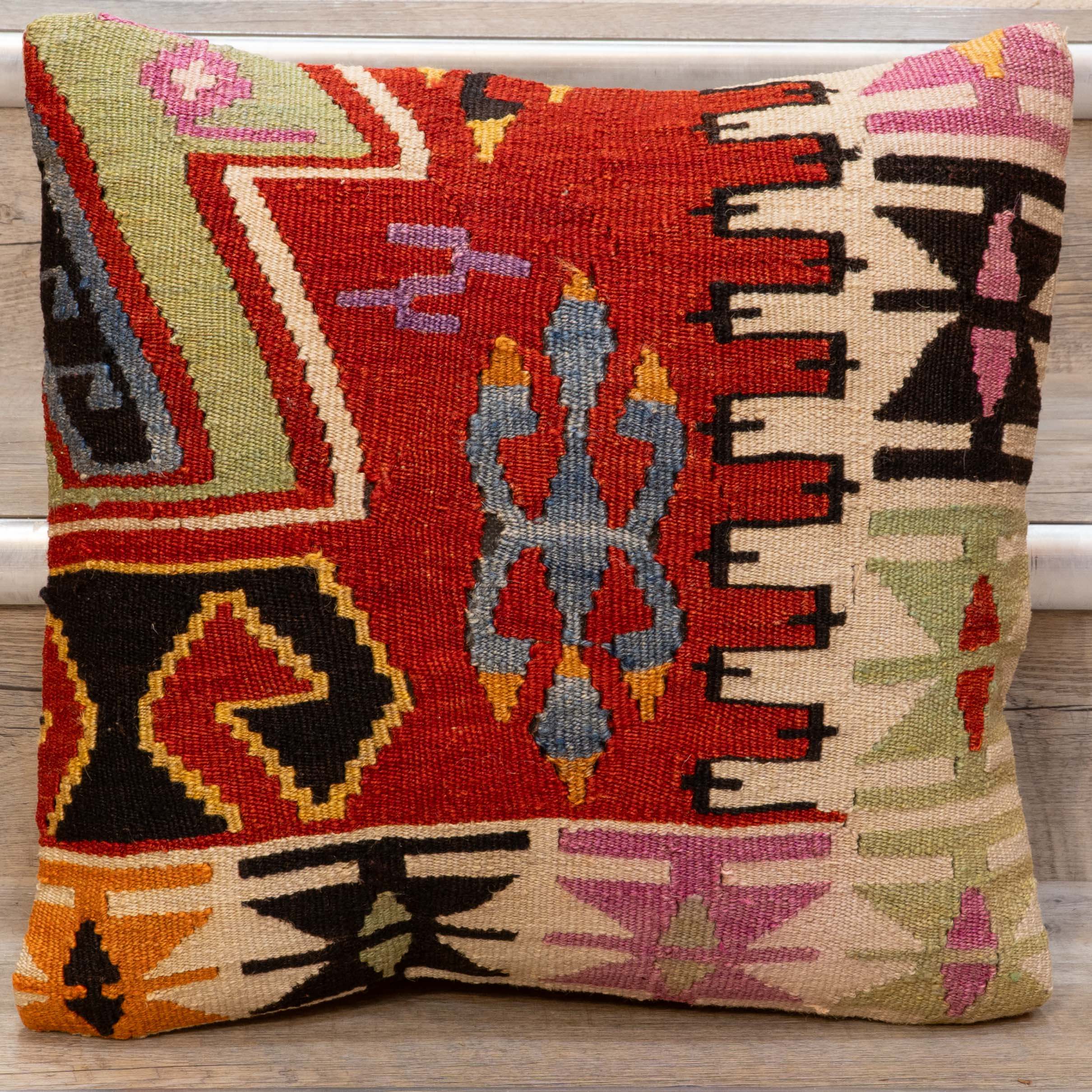 Our collection of kilim cushions offers great colours, designs, and textures. The pieces are often taken from larger old kilims, sometimes antique, and cleaned and sorted to repurpose and salvage a treasured fabric that would otherwise be lost. The pattern may be cut in unusual and interesting ways to ensure that as much of this precious resource as possible is saved. In addition, the cushions are fibre-filled, making them suitable for individuals with feather allergies.  Product size: 40 x 40cm (1'4 x 1'4)