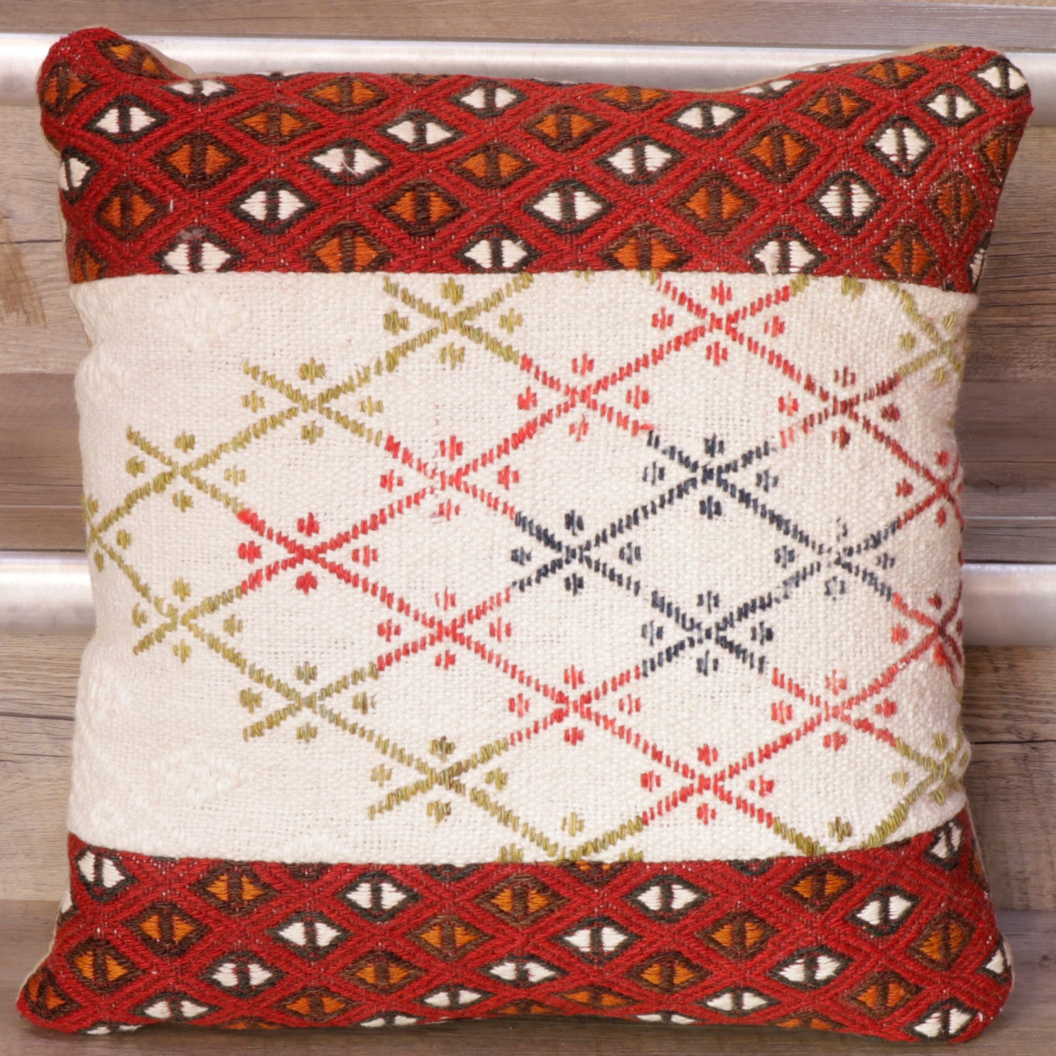 Our collection of Turkish kilim cushions offers great colours and texture. The pieces are often salvaged from old Turkish or Anatolian kilims, allowing the pattern to be cut in unusual and interesting ways. The fibre-filled cushions make them more suitable for individuals with feather allergy sensitivities. The contrasting kilim features embroidery in vibrant orange, red, cream, and black, which contrasts with the darker brown goat-hair fabric. The back of the cushion is usually made of faux suede or cotton.   Product size:40 x 40cm (16" x 16")