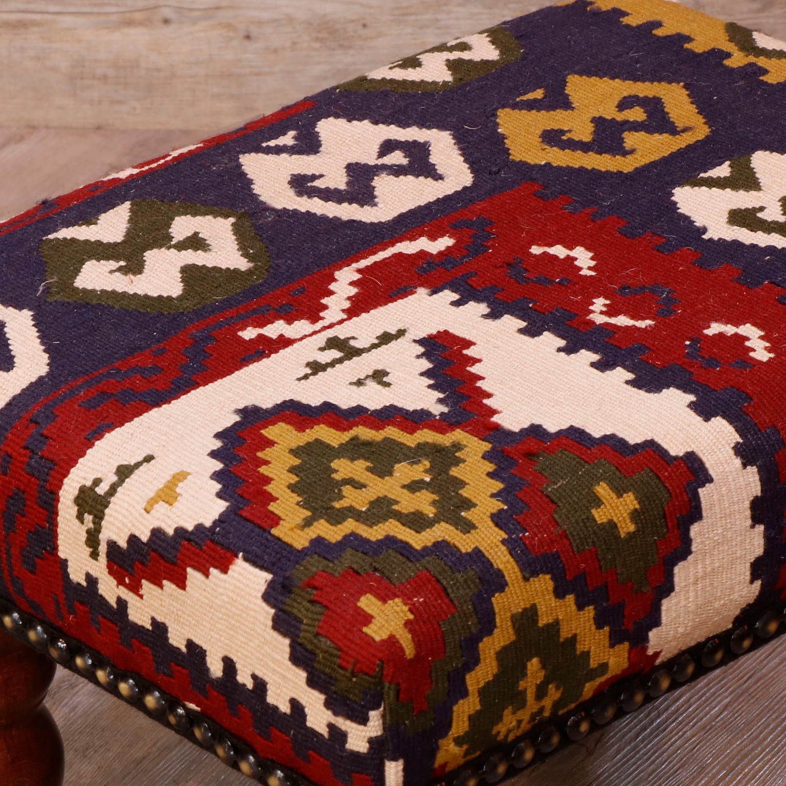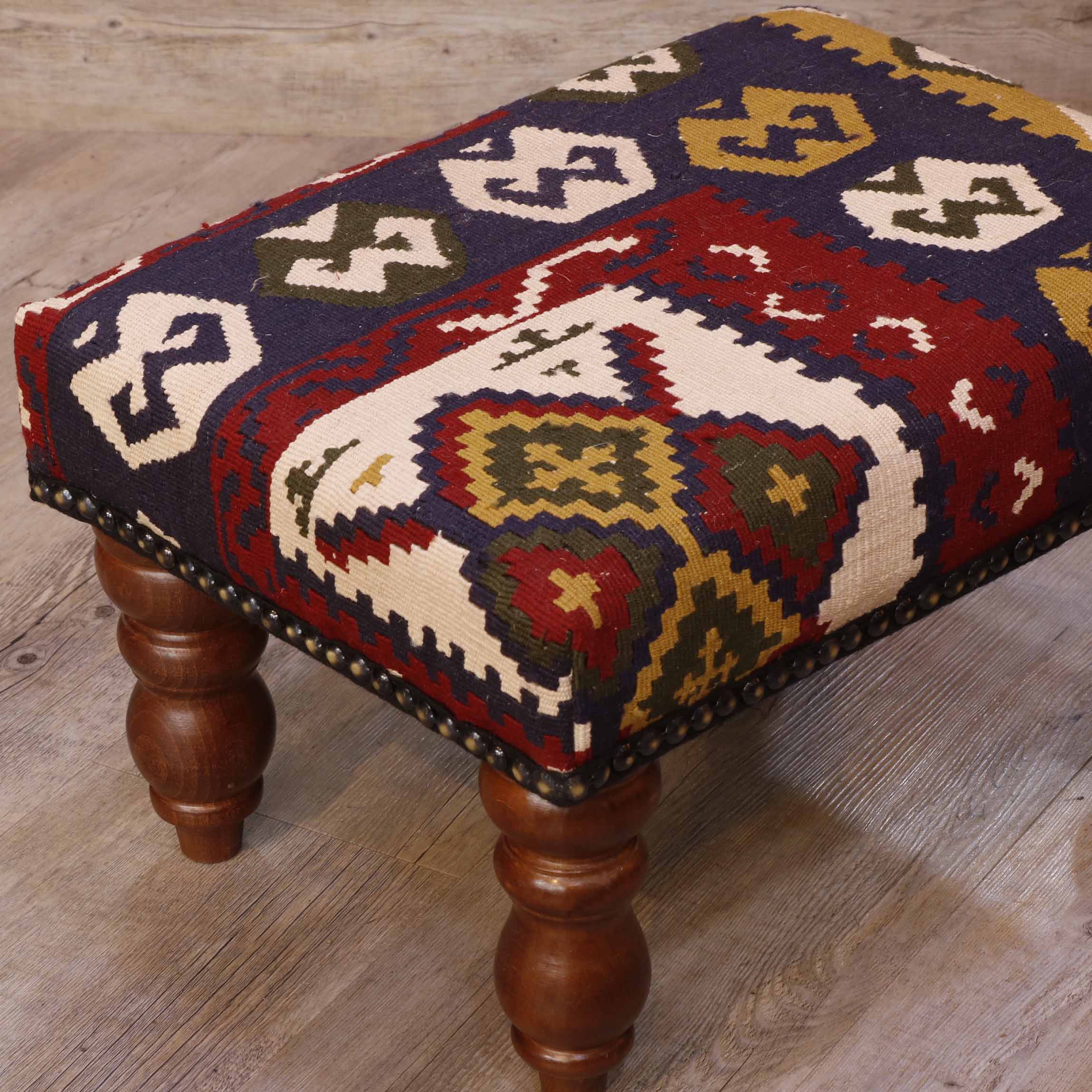 Our furnishing collection utilises pieces often salvaged from old Turkish kilim. As an expensive furnishing fabric, we ensure waste is kept to the absolute minimum. This desire to preserve every useable piece enables us to produce some smaller pieces, such as draught excluders or small cushions. With the footstool, the cut of the fabric often creates an interesting look as the Motifs or patterns may be offset rather than centred, making pieces unique and different. We also have a limited number of very individual and unique chairs, with no two pieces ever the same.