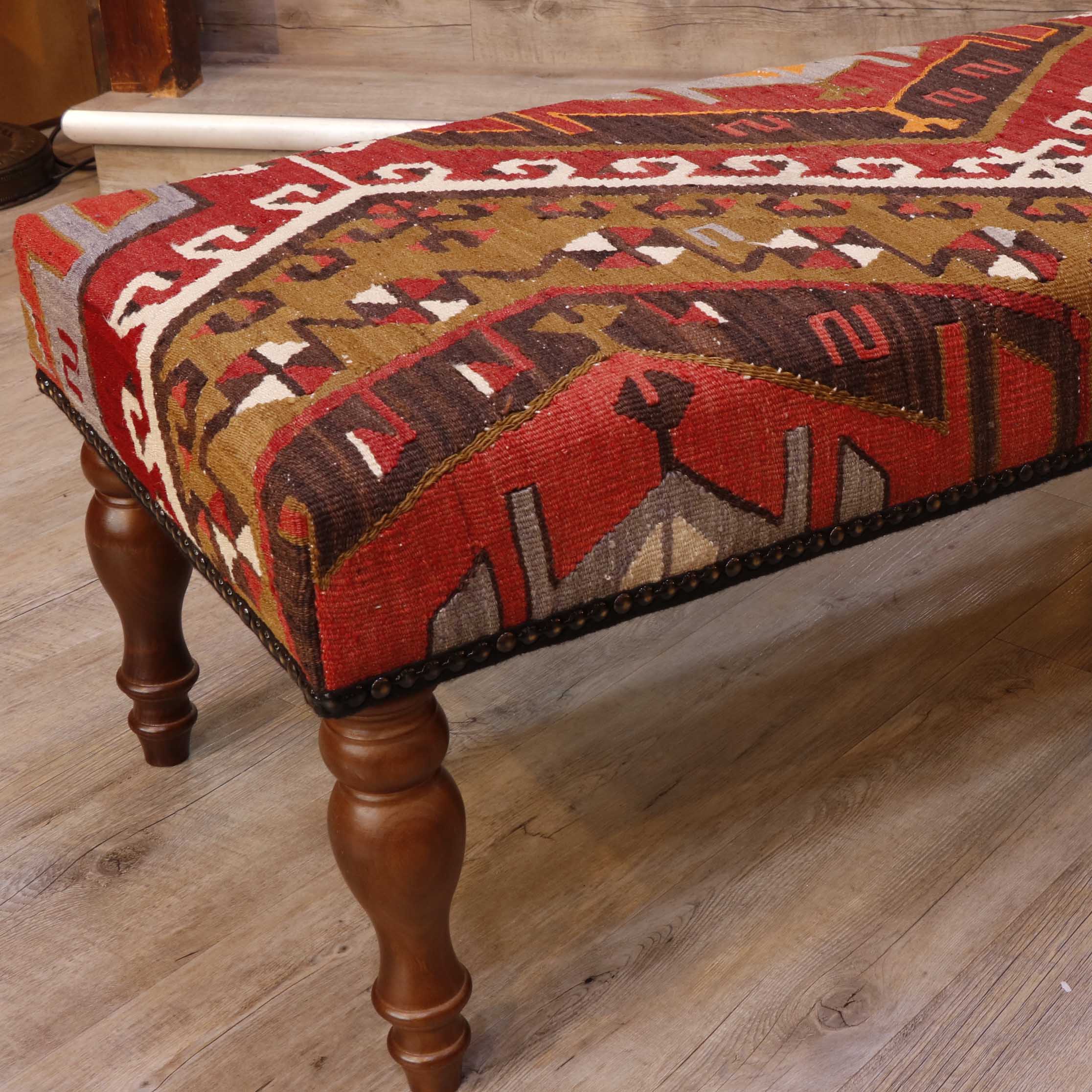 This long bench is another great, unique furnishing piece, as the fabric is old, repurposed Turkish floor Kilim. Although the kilim is old, it will continue to be a serviceable, valued item for many years. The old kilim looks much better over time; the colours are much softer, and age, in this instance, is kind.