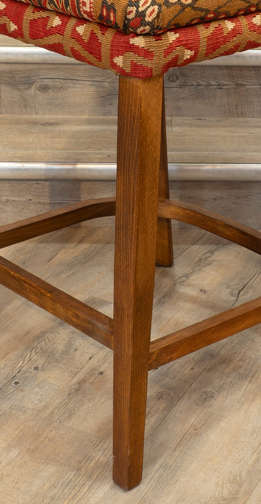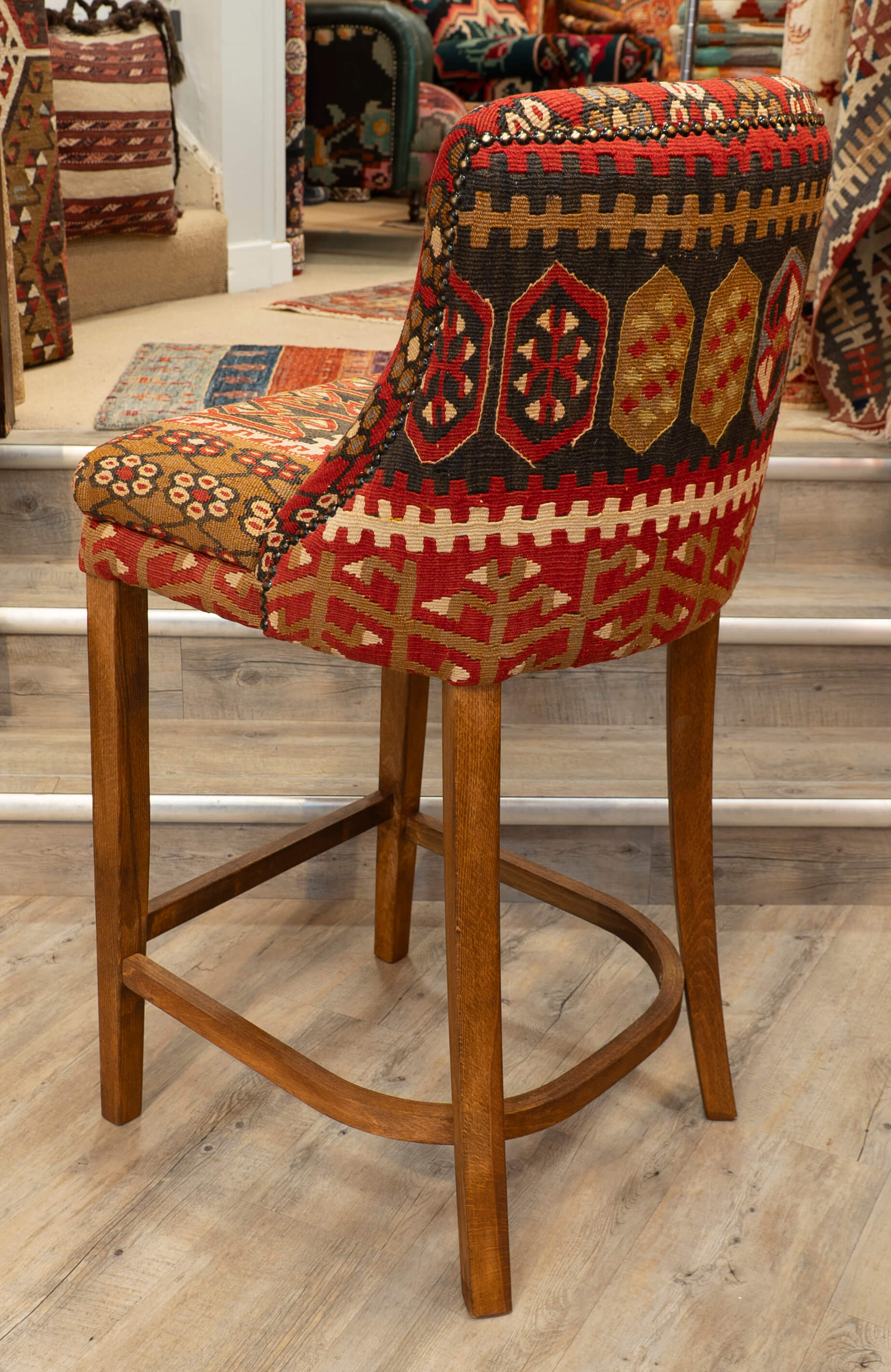 These interesting bar stools are very smart. The salvaged kilim has been repurposed to create interesting high stools, which will be a fabulous addition to anyone seeking something extra special and unique. Each piece of Kilim has been expertly placed to full effect; although we can't do multiple identical chairs, we try to get them made as 'Jack & Jill' pairs. Of course, if anyone requires more, we would cut kilims from the same piece to create a set that would be more like a 'harlequin set'. Don't hesitate to contact us to discuss this if needed. Finally, the chairs were studded around the back, and the wood was polished with Danish wax to a medium oak.